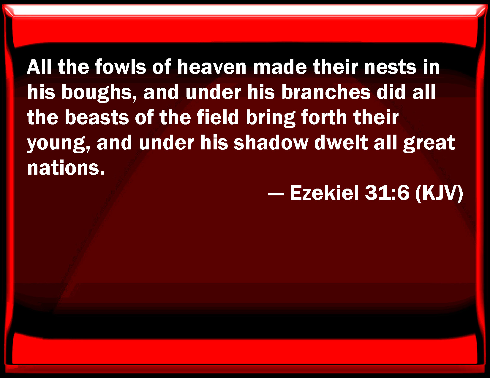 Bible Verse Slide Ezekiel 31:6 All the fowls of heaven made their nests in his boughs, and under his branches did all the beasts of the field bring forth their young, and under his shadow dwelled all great nations. KJV: All the fowls of heaven made their nests in his boughs, and under his branches did all the beasts of the field bring forth their young, and under his shadow dwelt all great nations. DRB: And when he had spread forth his shadow, all the fowls of the air made their nests in his boughs, and all the beasts of the forest brought forth their young under his branches, and the assembly of many nations dwelt under his shadow. DBT: All the fowl of the heavens made their nests in his boughs, and under his branches did all the beasts of the field bring forth their young, and under his shadow dwelt all the great nations. ERV: All the fowls of heaven made their nests in his boughs, and under his branches did all the beasts of the field bring forth their young, and under his shadow dwelt all great nations. WBT: All the fowls of heaven made their nests in his boughs, and under his branches did all the beasts of the field bring forth their young, and under his shade dwelt all great nations. WEB: All the birds of the sky made their nests in its boughs; and under its branches did all the animals of the field bring forth their young; and under its shadow lived all great nations. YLT: In his boughs made a nest hath every fowl of the heavens, And under his branches brought forth hath every beast of the field, And in his shade dwell do all great nations.Links Ezekiel 31:6 NIV • Ezekiel 31:6 NLT • Ezekiel 31:6 ESV • Ezekiel 31:6 NASB • Ezekiel 31:6 KJV • Ezekiel 31:6 Interlinear • Ezekiel 31:6 Commentaries • Ezekiel 31:6 Parallel Texts • Ezekiel 31:6 Bible Apps • Ezekiel 31:6 Parallel • Bible Hub |