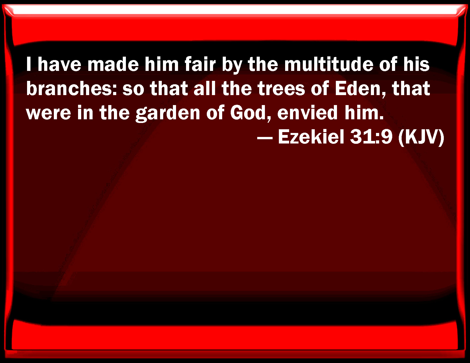 Bible Verse Slide Ezekiel 31:9 I have made him fair by the multitude of his branches: so that all the trees of Eden, that were in the garden of God, envied him. KJV: I have made him fair by the multitude of his branches: so that all the trees of Eden, that were in the garden of God, envied him. DRB: For I made him beautiful and thick set with many branches: and all the trees of pleasure, that were in the paradise of God, envied him. DBT: I had made him fair by the multitude of his branches; and all the trees of Eden, that were in the garden of God, envied him. ERV: I made him fair by the multitude of his branches: so that all the trees of Eden, that were in the garden of God, envied him. WBT: I have made him fair by the multitude of his branches: so that all the trees of Eden, that were in the garden of God, envied him. WEB: I made it beautiful by the multitude of its branches, so that all the trees of Eden, that were in the garden of God, envied it. YLT: Fair I have made him in the multitude of his thin shoots, And envy him do all trees of Eden that are in the garden of God.Links Ezekiel 31:9 NIV • Ezekiel 31:9 NLT • Ezekiel 31:9 ESV • Ezekiel 31:9 NASB • Ezekiel 31:9 KJV • Ezekiel 31:9 Interlinear • Ezekiel 31:9 Commentaries • Ezekiel 31:9 Parallel Texts • Ezekiel 31:9 Bible Apps • Ezekiel 31:9 Parallel • Bible Hub |