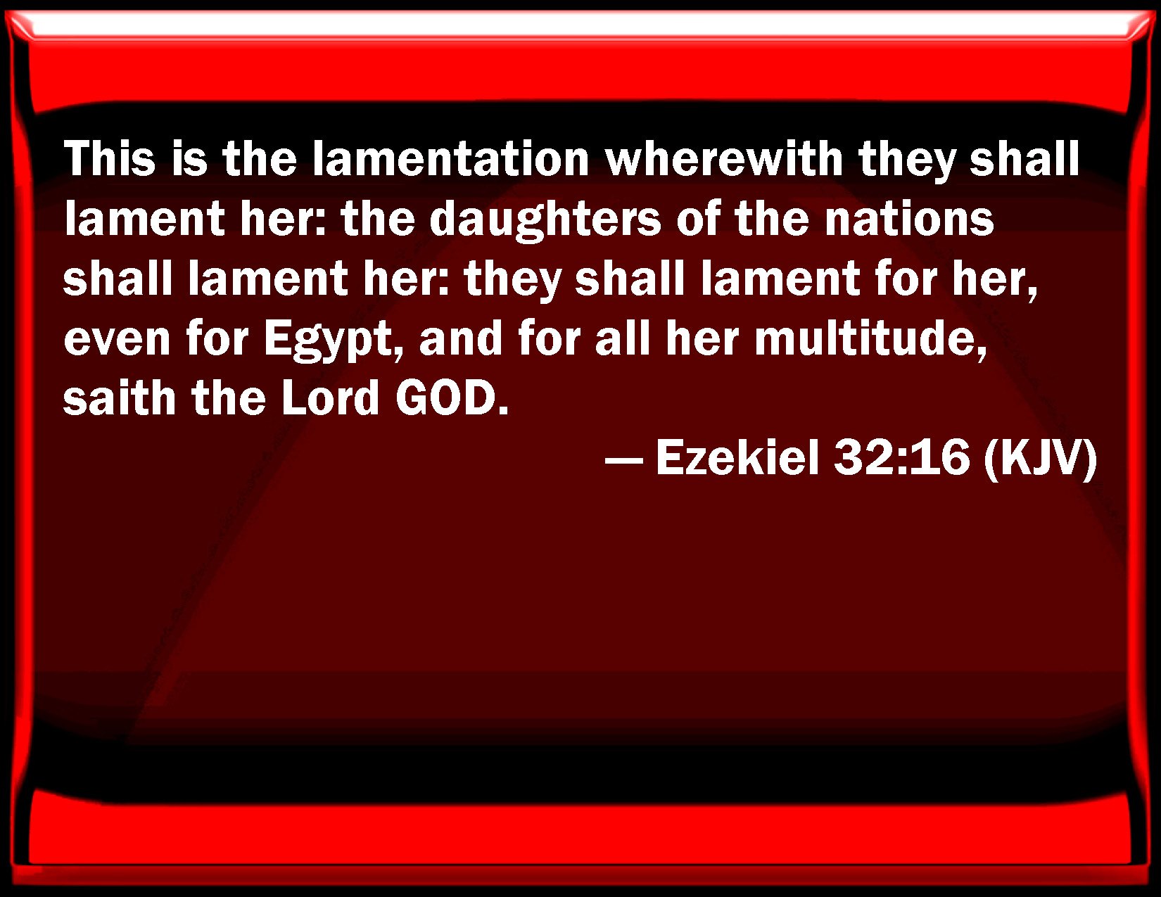 Bible Verse Slide Ezekiel 32:16 This is the lamentation with which they shall lament her: the daughters of the nations shall lament her: they shall lament for her, even for Egypt, and for all her multitude, said the Lord GOD. KJV: This is the lamentation wherewith they shall lament her: the daughters of the nations shall lament her: they shall lament for her, even for Egypt, and for all her multitude, saith the Lord GOD. DRB: This is the lamentation, and they shall lament therewith: the daughters of the nations shall lament therewith: for Egypt, and for the multitude thereof they shall lament therewith, saith the Lord God. DBT: It is a lamentation, and thus they shall lament her: the daughters of the nations shall say it in lamenting; they shall say it in lamenting over Egypt and over all her multitude, saith the Lord Jehovah. ERV: This is the lamentation wherewith they shall lament; the daughters of the nations shall lament therewith: for Egypt, and for all her multitude, shall they lament therewith, saith the Lord GOD. WBT: This is the lamentation with which they shall lament her: the daughters of the nations shall lament her: they shall lament for her, even for Egypt, and for all her multitude, saith the Lord GOD. WEB: This is the lamentation with which they shall lament; the daughters of the nations shall lament therewith; over Egypt, and over all her multitude, shall they lament therewith, says the Lord Yahweh. YLT: A lamentation it is, and they have lamented her, Daughters of the nations do lament her, For Egypt, and for all her multitude, they lament her, An affirmation of the Lord Jehovah.'Links Ezekiel 32:16 NIV • Ezekiel 32:16 NLT • Ezekiel 32:16 ESV • Ezekiel 32:16 NASB • Ezekiel 32:16 KJV • Ezekiel 32:16 Interlinear • Ezekiel 32:16 Commentaries • Ezekiel 32:16 Parallel Texts • Ezekiel 32:16 Bible Apps • Ezekiel 32:16 Parallel • Bible Hub |