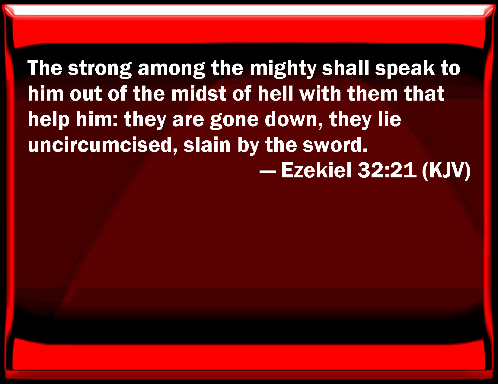 Bible Verse Slide Ezekiel 32:21 The strong among the mighty shall speak to him out of the middle of hell with them that help him: they are gone down, they lie uncircumcised, slain by the sword. KJV: The strong among the mighty shall speak to him out of the midst of hell with them that help him: they are gone down, they lie uncircumcised, slain by the sword. DRB: The most mighty among the strong ones shall speak to him from the midst of hell, they that went down with his helpers, and slept uncircumcised, slain by the sword. DBT: The strong among the mighty, with them that helped him, shall speak to him out of the midst of Sheol: they are gone down, they lie still, the uncircumcised, slain by the sword. ERV: The strong among the mighty shall speak to him out of the midst of hell with them that help him: they are gone down, they lie still, even the uncircumcised, slain by the sword. WBT: The strong among the mighty shall speak to him out of the midst of the grave with them that help him: they are gone down, they lie uncircumcised, slain by the sword. WEB: The strong among the mighty shall speak to him out of the midst of Sheol with those who help him: they are gone down, they lie still, even the uncircumcised, slain by the sword. YLT: Speak to him do the gods of the mighty out of the midst of sheol, With his helpers — they have gone down, They have lain with the uncircumcised, The pierced of the sword.Links Ezekiel 32:21 NIV • Ezekiel 32:21 NLT • Ezekiel 32:21 ESV • Ezekiel 32:21 NASB • Ezekiel 32:21 KJV • Ezekiel 32:21 Interlinear • Ezekiel 32:21 Commentaries • Ezekiel 32:21 Parallel Texts • Ezekiel 32:21 Bible Apps • Ezekiel 32:21 Parallel • Bible Hub |