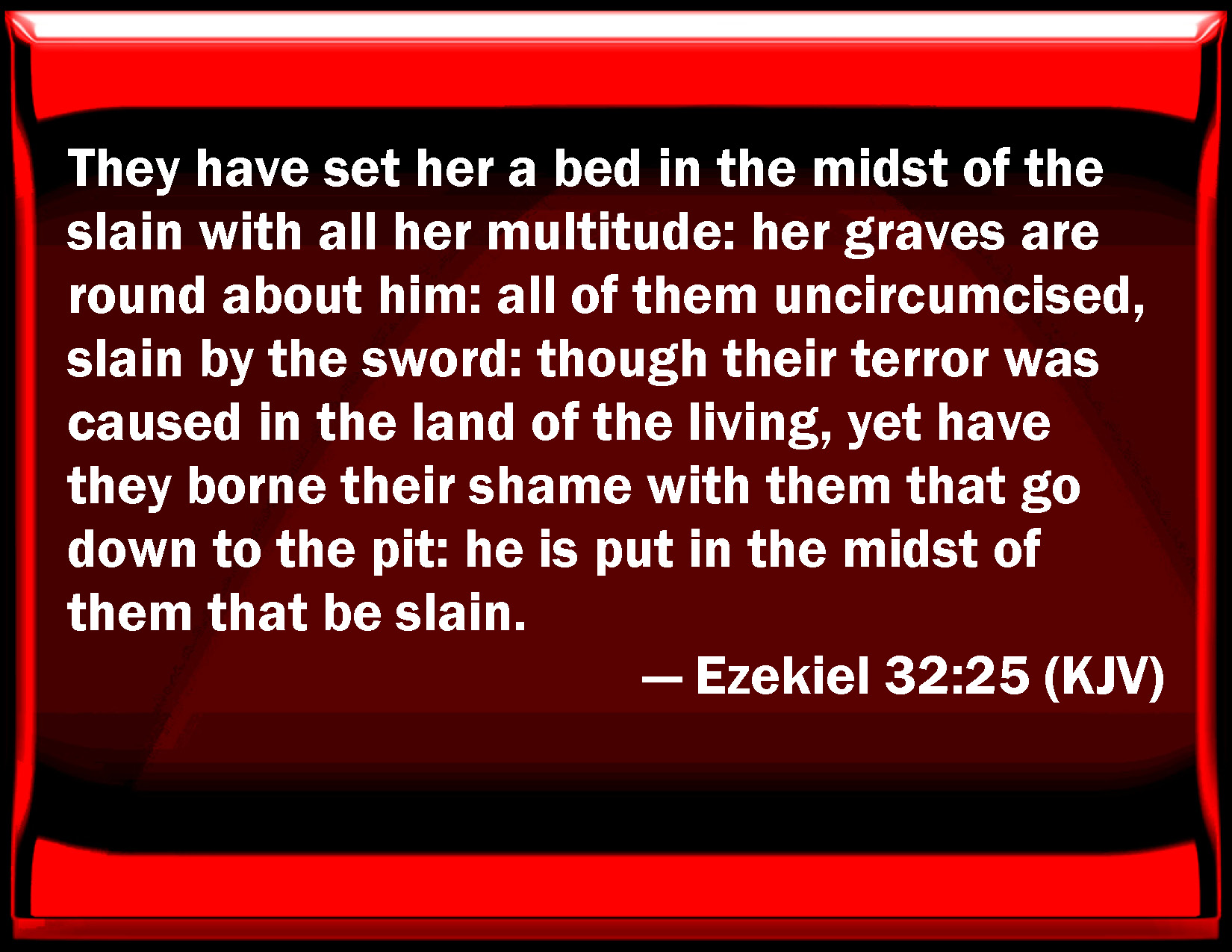 They have set him a bed in the midst of the slain, with all his multitude: their graves are round about him, all of them uncircumcised, slain by the sword, though their terror was caused in the land of the living; and they have borne their confusion with them that go down to the pit: he is put in the midst of them that are slain.