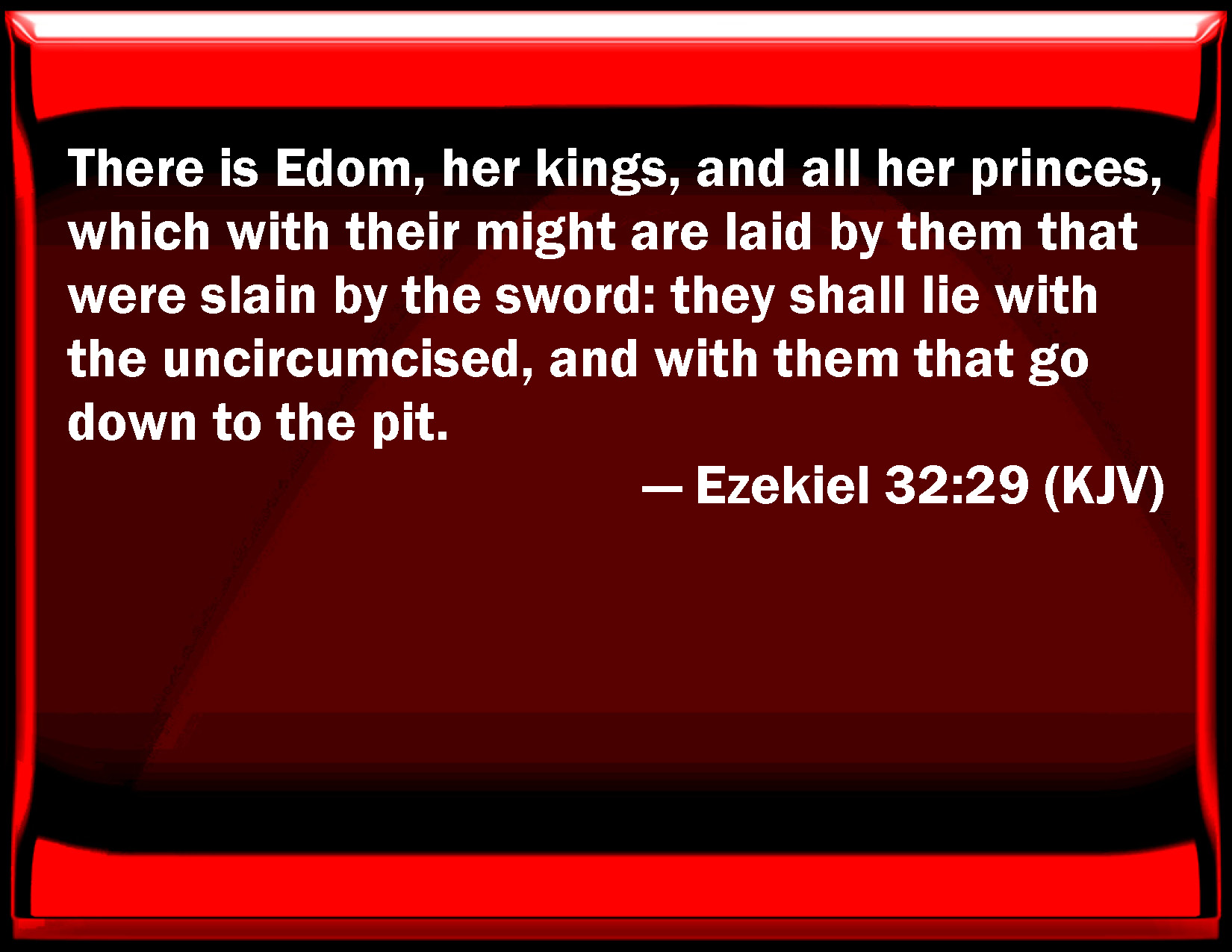 Bible Verse Slide Ezekiel 32:29 There is Edom, her kings, and all her princes, which with their might are laid by them that were slain by the sword: they shall lie with the uncircumcised, and with them that go down to the pit. KJV: There is Edom, her kings, and all her princes, which with their might are laid by them that were slain by the sword: they shall lie with the uncircumcised, and with them that go down to the pit. DRB: There is Edom, and her kings, and all her princes, who with their army are joined with them that are slain by the sword: and have slept with the uncircumcised, and with them that go down into the pit. DBT: There is Edom, her kings, and all her princes, who in their might are laid with them that are slain by the sword: they lie with the uncircumcised, and with them that go down to the pit. ERV: There is Edom, her kings and all her princes, which in their might are laid with them that are slain by the sword: they shall lie with the uncircumcised, and with them that go down to the pit. WBT: There is Edom, her kings, and all her princes, who with their might are laid by them that were slain by the sword: they shall lie with the uncircumcised, and with them that go down to the pit. WEB: There is Edom, her kings and all her princes, who in their might are laid with those who are slain by the sword: they shall lie with the uncircumcised, and with those who go down to the pit. YLT: There is Edom, her kings, and all her princes, Who have been given up in their might, With the pierced of the sword, They with the uncircumcised do lie, And with those going down to the pit.Links Ezekiel 32:29 NIV • Ezekiel 32:29 NLT • Ezekiel 32:29 ESV • Ezekiel 32:29 NASB • Ezekiel 32:29 KJV • Ezekiel 32:29 Interlinear • Ezekiel 32:29 Commentaries • Ezekiel 32:29 Parallel Texts • Ezekiel 32:29 Bible Apps • Ezekiel 32:29 Parallel • Bible Hub |