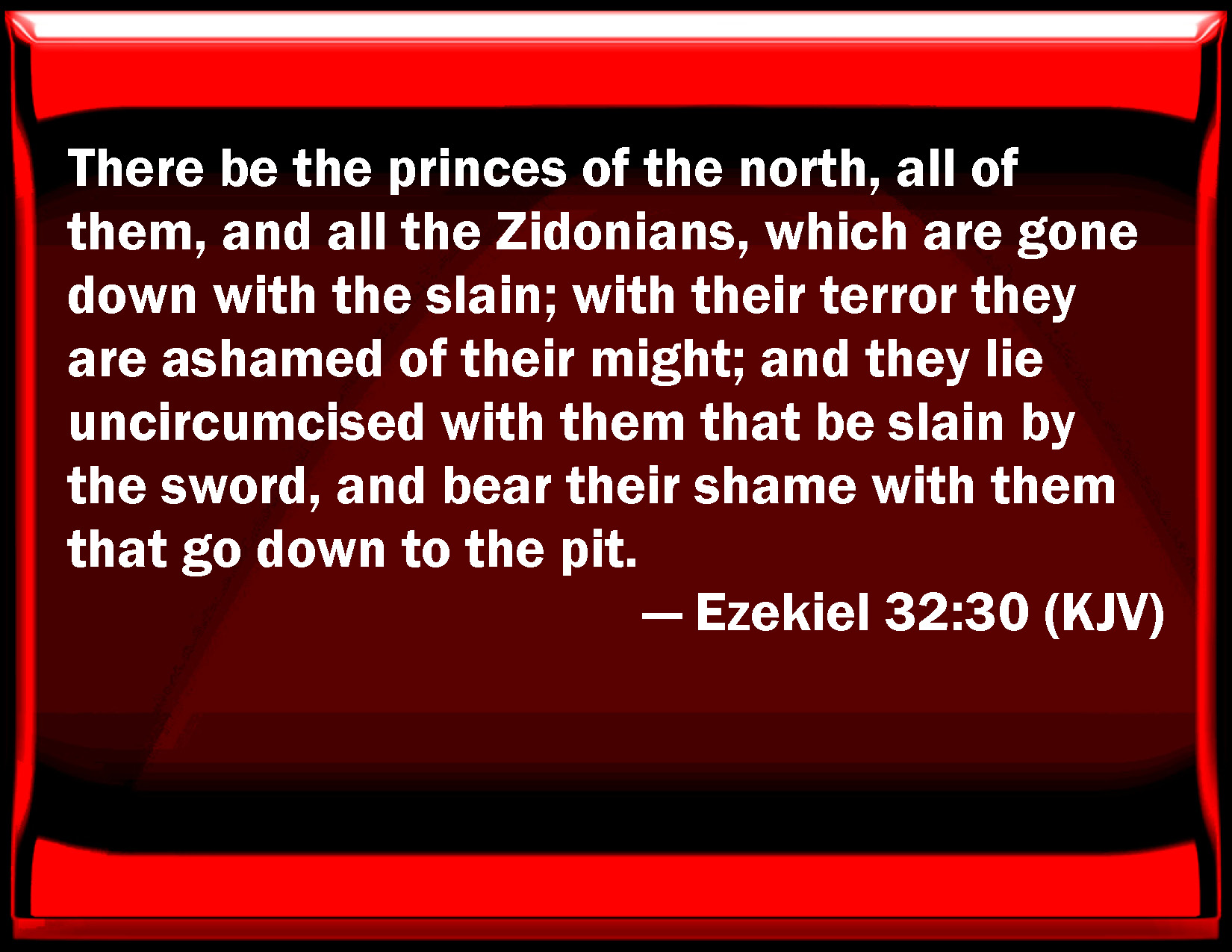 Bible Verse Slide Ezekiel 32:30 There be the princes of the north, all of them, and all the Zidonians, which are gone down with the slain; with their terror they are ashamed of their might; and they lie uncircumcised with them that be slain by the sword, and bear their shame with them that go down to the pit. KJV: There be the princes of the north, all of them, and all the Zidonians, which are gone down with the slain; with their terror they are ashamed of their might; and they lie uncircumcised with them that be slain by the sword, and bear their shame with them that go down to the pit. DRB: There are all the princes of the north, and all the hunters: who were brought down with the slain, fearing, and con- founded in their strength: who slept uncircumcised with them that are slain by the sword, and have borne their shame with them that go down into the pit. DBT: There are the princes of the north, all of them, and all the Zidonians, that are gone down with the slain ashamed of the terror which they caused through their might; and they lie uncircumcised with them that are slain by the sword, and bear their confusion with them that go down to the pit. ERV: There be the princes of the north, all of them, and all the Zidonians, which are gone down with the slain; in the terror which they caused by their might they are ashamed; and they lie uncircumcised with them that are slain by the sword, and bear their shame with them that go down to the pit. WBT: There are the princes of the north, all of them, and all the Zidonians, who are gone down with the slain; with their terror they are ashamed of their might; and they lie uncircumcised with them that are slain by the sword, and bear their shame with them that go down to the pit. WEB: There are the princes of the north, all of them, and all the Sidonians, who are gone down with the slain; in the terror which they caused by their might they are put to shame; and they lie uncircumcised with those who are slain by the sword, and bear their shame with those who go down to the pit. YLT: There are princes of the north, All of them, and every Zidonian, Who have gone down with the pierced in their terror, Of their might they are ashamed, And they lie uncircumcised with the pierced of the sword, And they bear their shame with those going down to the pit.Links Ezekiel 32:30 NIV • Ezekiel 32:30 NLT • Ezekiel 32:30 ESV • Ezekiel 32:30 NASB • Ezekiel 32:30 KJV • Ezekiel 32:30 Interlinear • Ezekiel 32:30 Commentaries • Ezekiel 32:30 Parallel Texts • Ezekiel 32:30 Bible Apps • Ezekiel 32:30 Parallel • Bible Hub |