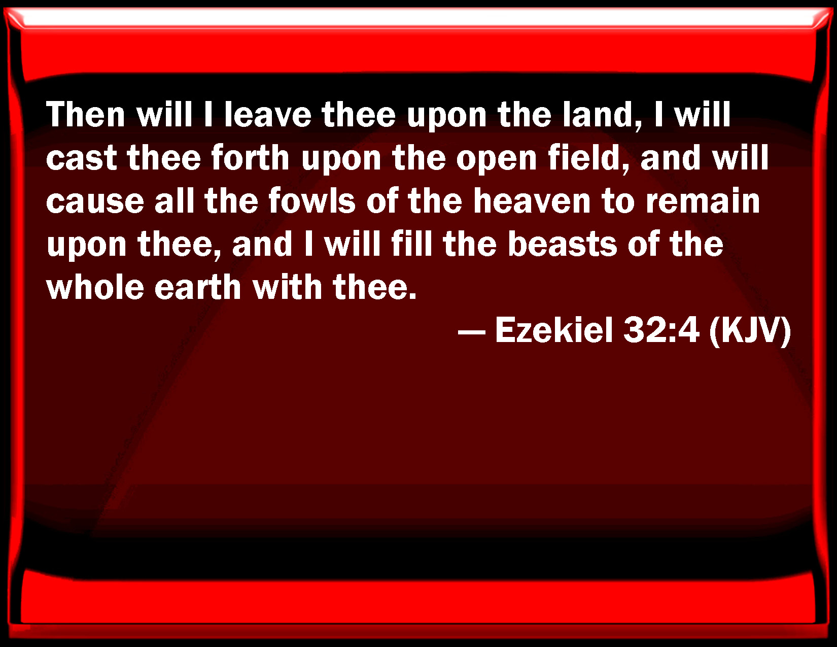Bible Verse Slide Ezekiel 32:4 Then will I leave you on the land, I will cast you forth on the open field, and will cause all the fowls of the heaven to remain on you, and I will fill the beasts of the whole earth with you. KJV: Then will I leave thee upon the land, I will cast thee forth upon the open field, and will cause all the fowls of the heaven to remain upon thee, and I will fill the beasts of the whole earth with thee. DRB: And I will throw thee out on the land, I will cast thee away into the open field: and I will cause all the fowls of the air to dwell upon thee, and I will fill the beasts of all the earth with thee. DBT: And I will leave thee upon the land, I will cast thee forth upon the open field, and will cause all the fowl of the heavens to settle upon thee, and I will fill the beasts of the whole earth with thee. ERV: And I will leave thee upon the land, I will cast thee forth upon the open field, and will cause all the fowls of the heaven to settle upon thee, and I will satisfy the beasts of the whole earth with thee. WBT: Then will I leave thee upon the land, and I will cast thee forth upon the open field, and will cause all the fowls of the heaven to remain upon thee, and I will fill the beasts of the whole earth with thee. WEB: I will leave you on the land, I will cast you forth on the open field, and will cause all the birds of the sky to settle on you, and I will satisfy the animals of the whole earth with you. YLT: And I have left thee in the land, On the face of the field I do cast thee out, And have caused to dwell upon thee every fowl of the heavens, And have satisfied out of thee the beasts of the whole earth.Links Ezekiel 32:4 NIV • Ezekiel 32:4 NLT • Ezekiel 32:4 ESV • Ezekiel 32:4 NASB • Ezekiel 32:4 KJV • Ezekiel 32:4 Interlinear • Ezekiel 32:4 Commentaries • Ezekiel 32:4 Parallel Texts • Ezekiel 32:4 Bible Apps • Ezekiel 32:4 Parallel • Bible Hub |