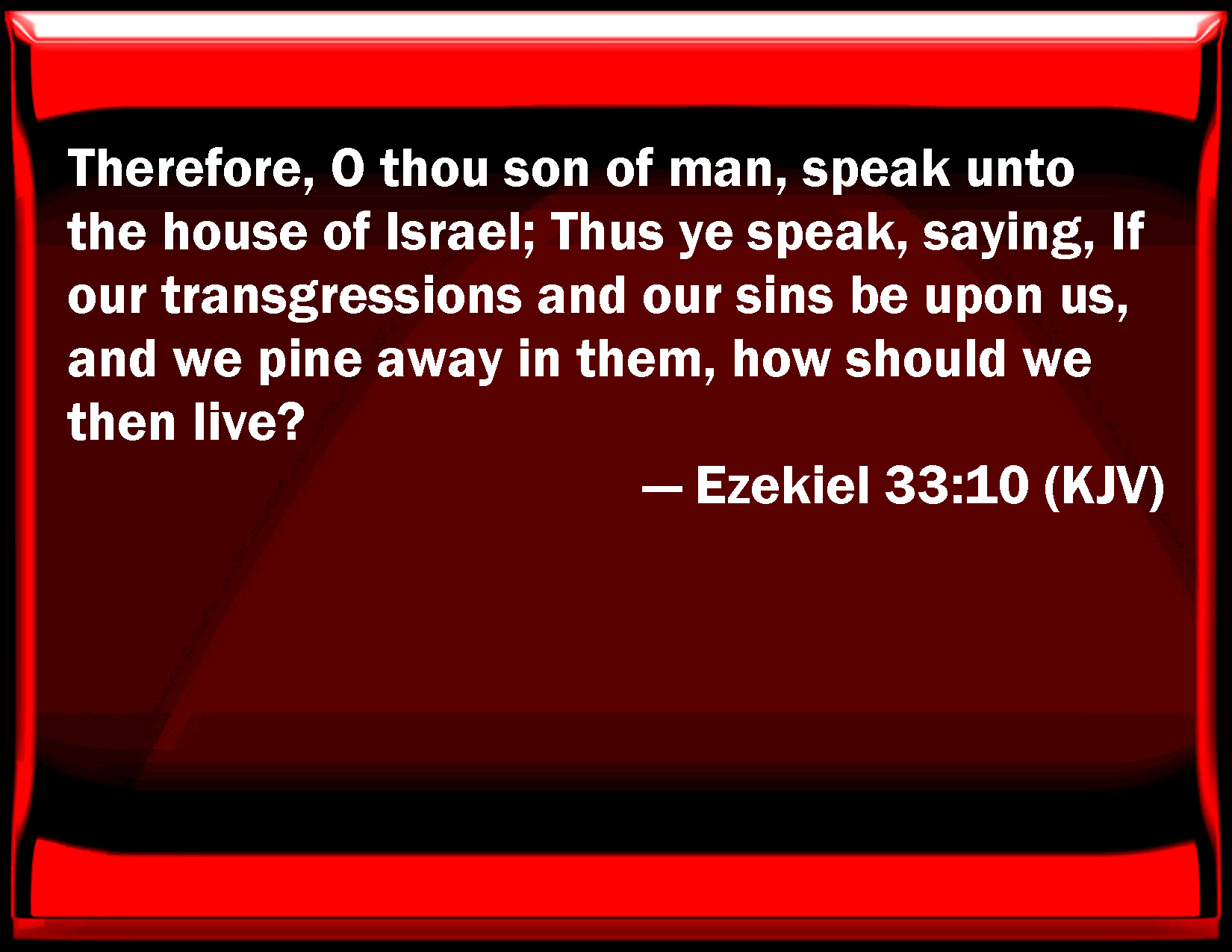Bible Verse Slide Ezekiel 33:10 Therefore, O you son of man, speak to the house of Israel; Thus you speak, saying, If our transgressions and our sins be on us, and we pine away in them, how should we then live? KJV: Therefore, O thou son of man, speak unto the house of Israel; Thus ye speak, saying, If our transgressions and our sins be upon us, and we pine away in them, how should we then live? DRB: Thou therefore, O son of man, say to the house of Israel: Thus you have spoken, saying: Our iniquities, and our sins are upon us, and we pine away in them: how then can we live? DBT: And thou, son of man, say unto the house of Israel, Thus ye speak, saying, Our transgressions and our sins are upon us, and we waste away in them, how then should we live? ERV: And thou, son of man, say unto the house of Israel: Thus ye speak, saying, Our transgressions and our sins are upon us, and we pine away in them; how then should we live? WBT: Therefore, O thou son of man, speak to the house of Israel; Thus ye speak, saying, If our transgressions and our sins are upon us, and we pine away in them, how should we then live? WEB: You, son of man, tell the house of Israel: Thus you speak, saying, Our transgressions and our sins are on us, and we pine away in them; how then can we live? YLT: And thou, son of man, say unto the house of Israel: Rightly ye have spoken, saying: Surely our transgressions and our sins are on us, And in them we are wasting away, How, then, do we live?Links Ezekiel 33:10 NIV • Ezekiel 33:10 NLT • Ezekiel 33:10 ESV • Ezekiel 33:10 NASB • Ezekiel 33:10 KJV • Ezekiel 33:10 Interlinear • Ezekiel 33:10 Commentaries • Ezekiel 33:10 Parallel Texts • Ezekiel 33:10 Bible Apps • Ezekiel 33:10 Parallel • Bible Hub |