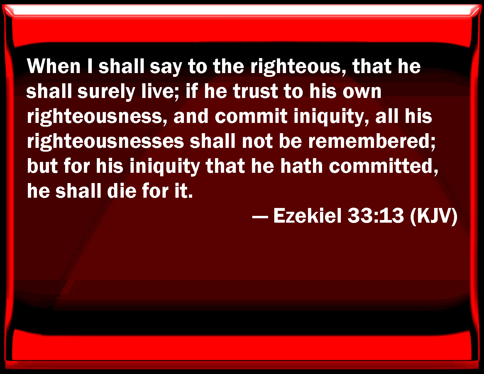 Bible Verse Slide Ezekiel 33:13 When I shall say to the righteous, that he shall surely live; if he trust to his own righteousness, and commit iniquity, all his righteousnesses shall not be remembered; but for his iniquity that he has committed, he shall die for it. KJV: When I shall say to the righteous, that he shall surely live; if he trust to his own righteousness, and commit iniquity, all his righteousnesses shall not be remembered; but for his iniquity that he hath committed, he shall die for it. DRB: Yea, if I shall say to the just that he shall surely live, and he, trusting in his justice, commit iniquity: all his justices shall be forgotten, and in his iniquity, which he hath committed, in the same shall he die. DBT: When I say to the righteous that he shall certainly live, and he trusteth to his righteousness and doeth what is wrong, none of his righteous acts shall be remembered; but in his unrighteousness which he hath done, in it shall he die. ERV: When I say to the righteous, that he shall surely live; if he trust to his righteousness, and commit iniquity, none of his righteous deeds shall be remembered; but in his iniquity that he hath committed, therein shall he die. WBT: When I shall say to the righteous, that he shall surely live; if he shall trust to his own righteousness, and commit iniquity, all his righteousnesses shall not be remembered; but for his iniquity that he hath committed, he shall die for it. WEB: When I tell the righteous, that he shall surely live; if he trust to his righteousness, and commit iniquity, none of his righteous deeds shall be remembered; but in his iniquity that he has committed, therein shall he die. YLT: In My saying of the righteous: He surely liveth, And — he hath trusted on his righteousness, And he hath done perversity, All his righteous acts are not remembered, And for his perversity that he hath done, For it he doth die.Links Ezekiel 33:13 NIV • Ezekiel 33:13 NLT • Ezekiel 33:13 ESV • Ezekiel 33:13 NASB • Ezekiel 33:13 KJV • Ezekiel 33:13 Interlinear • Ezekiel 33:13 Commentaries • Ezekiel 33:13 Parallel Texts • Ezekiel 33:13 Bible Apps • Ezekiel 33:13 Parallel • Bible Hub |