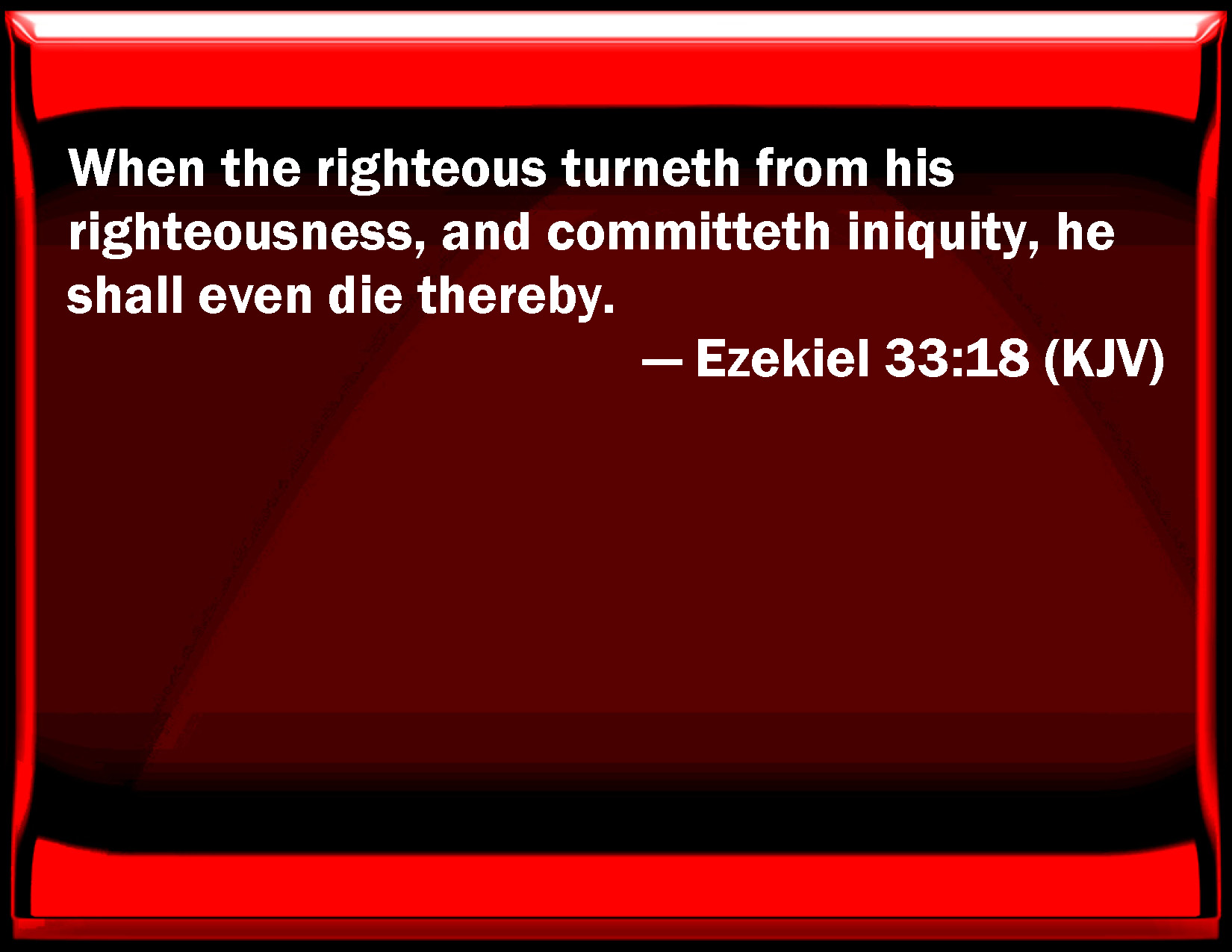 Bible Verse Slide Ezekiel 33:18 When the righteous turns from his righteousness, and commits iniquity, he shall even die thereby. KJV: When the righteous turneth from his righteousness, and committeth iniquity, he shall even die thereby. DRB: For when the just shall depart from his justice, and commit iniquities, he shall die in them. DBT: When the righteous turneth from his righteousness, and doeth what is wrong, then he shall die therein. ERV: When the righteous turneth from his righteousness, and committeth iniquity, he shall even die therein. WBT: When the righteous turneth from his righteousness, and committeth iniquity, for that he shall even die. WEB: When the righteous turns from his righteousness, and commits iniquity, he shall even die therein. YLT: In the turning back of the righteous from his righteousness, And he hath done perversity — he dieth for it.Links Ezekiel 33:18 NIV • Ezekiel 33:18 NLT • Ezekiel 33:18 ESV • Ezekiel 33:18 NASB • Ezekiel 33:18 KJV • Ezekiel 33:18 Interlinear • Ezekiel 33:18 Commentaries • Ezekiel 33:18 Parallel Texts • Ezekiel 33:18 Bible Apps • Ezekiel 33:18 Parallel • Bible Hub |
