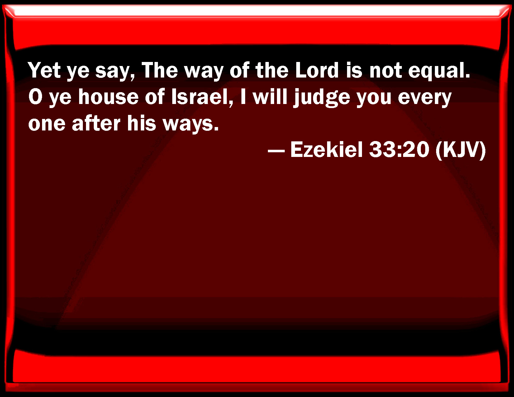 Bible Verse Slide Ezekiel 33:20 Yet you say, The way of the Lord is not equal. O you house of Israel, I will judge you every one after his ways. KJV: Yet ye say, The way of the Lord is not equal. O ye house of Israel, I will judge you every one after his ways. DRB: And you say: The way of the Lord is not right, I will judge every one of you according to his ways, O house of Israel. DBT: Yet ye say, The way of the Lord is not equal. O house of Israel, I will judge you every one after his ways. ERV: Yet ye say, The way of the Lord is not equal. O house of Israel, I will judge you every one after his ways. WBT: Yet ye say, The way of the Lord is not equal. O ye house of Israel, I will judge you every one after his ways. WEB: Yet you say, The way of the Lord is not equal. House of Israel, I will judge every one of you after his ways. YLT: And ye have said: The way of the Lord is not pondered, Each according to his ways do I judge you, O house of Israel.'Links Ezekiel 33:20 NIV • Ezekiel 33:20 NLT • Ezekiel 33:20 ESV • Ezekiel 33:20 NASB • Ezekiel 33:20 KJV • Ezekiel 33:20 Interlinear • Ezekiel 33:20 Commentaries • Ezekiel 33:20 Parallel Texts • Ezekiel 33:20 Bible Apps • Ezekiel 33:20 Parallel • Bible Hub |