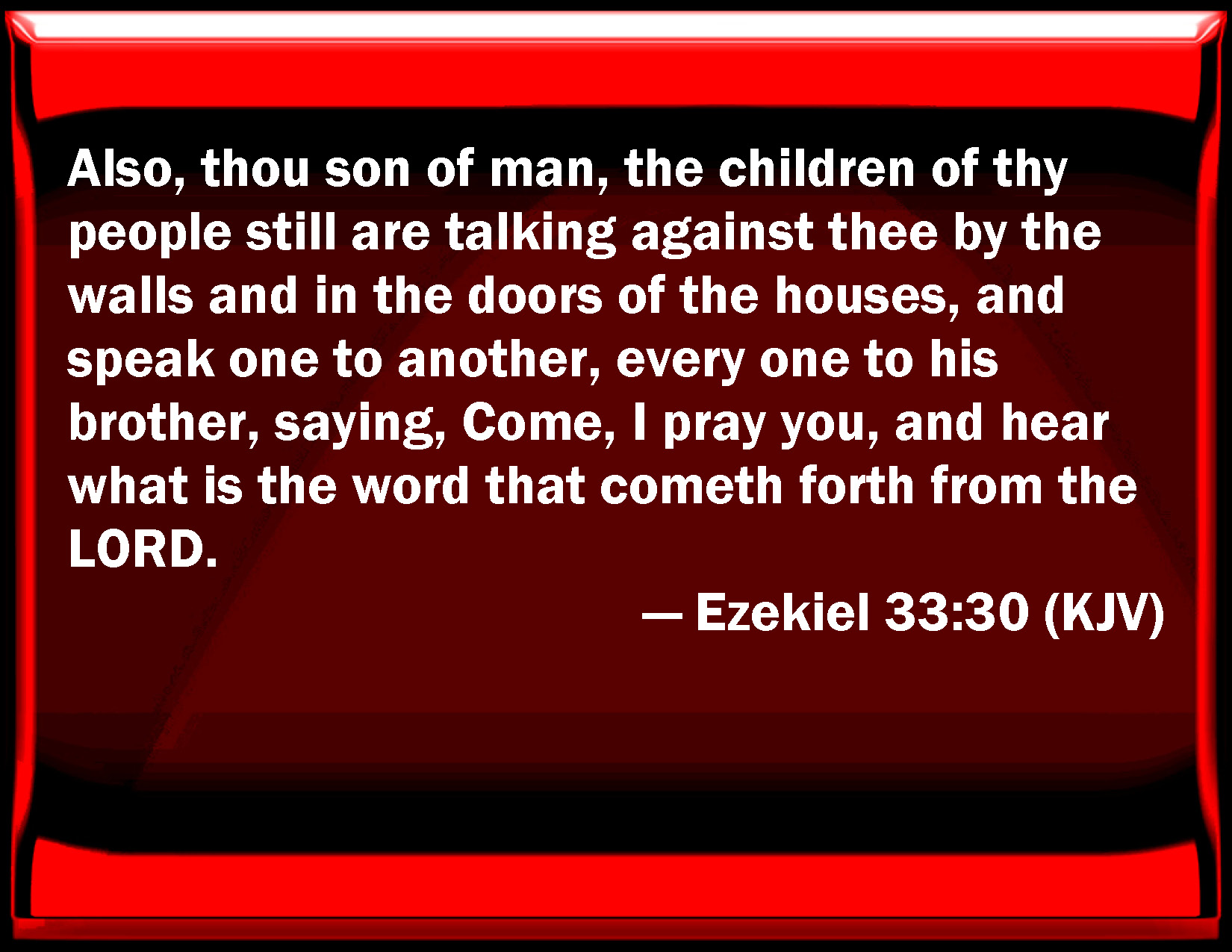 Bible Verse Slide Ezekiel 33:30 Also, you son of man, the children of your people still are talking against you by the walls and in the doors of the houses, and speak one to another, every one to his brother, saying, Come, I pray you, and hear what is the word that comes forth from the LORD. KJV: Also, thou son of man, the children of thy people still are talking against thee by the walls and in the doors of the houses, and speak one to another, every one to his brother, saying, Come, I pray you, and hear what is the word that cometh forth from the LORD. DRB: And thou son of man: the children of thy people, that talk of thee by the walls, and in the doors of the houses, and speak one to another each men to his neighbour, saying: Come, and let us hear what is the word that cometh forth from the Lord. DBT: And as for thee, son of man, the children of thy people keep talking of thee by the walls and in the doors of the houses, and speak one to another, every one to his brother, saying, Come, I pray you, and hear what is the word that cometh forth from Jehovah. ERV: And as for thee, son of man, the children of thy people talk of thee by the walls and in the doors of the houses, and speak one to another, everyone to his brother, saying, Come, I pray you, and hear what is the word that cometh forth from the LORD. WBT: Also, thou son of man, the children of thy people still are talking against thee by the walls and in the doors of the houses, and speak one to another, every one to his brother, saying, Come, I pray you, and hear what is the word that cometh forth from the LORD. WEB: As for you, son of man, the children of your people talk of you by the walls and in the doors of the houses, and speak one to another, everyone to his brother, saying, Please come and hear what is the word that comes forth from Yahweh. YLT: And thou, son of man, the sons of thy people who are speaking about thee, By the walls, and in openings of the houses, Have spoken one with another, each with his brother, Saying: Come in, I pray you, And hear what is the word that cometh out from Jehovah.Links Ezekiel 33:30 NIV • Ezekiel 33:30 NLT • Ezekiel 33:30 ESV • Ezekiel 33:30 NASB • Ezekiel 33:30 KJV • Ezekiel 33:30 Interlinear • Ezekiel 33:30 Commentaries • Ezekiel 33:30 Parallel Texts • Ezekiel 33:30 Bible Apps • Ezekiel 33:30 Parallel • Bible Hub |