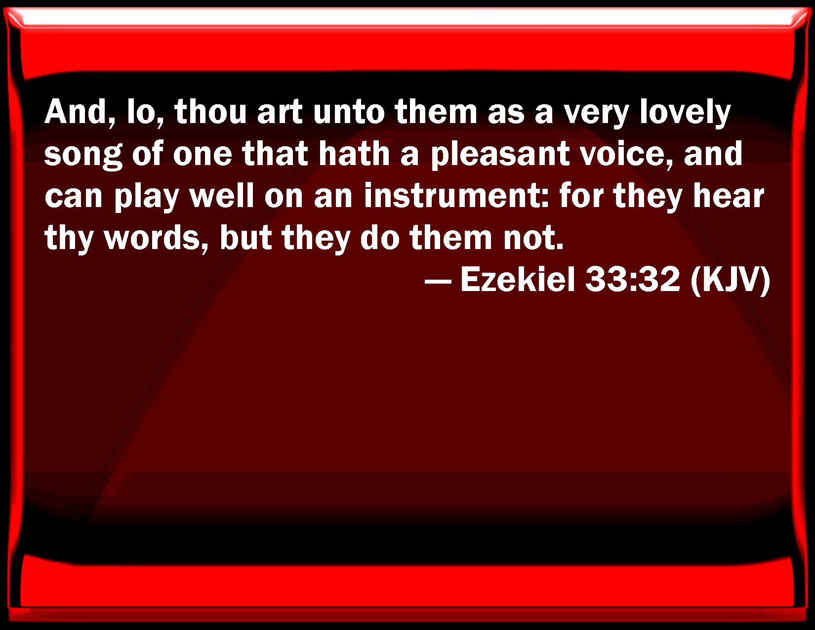 Bible Verse Slide Ezekiel 33:32 And, see, you are to them as a very lovely song of one that has a pleasant voice, and can play well on an instrument: for they hear your words, but they do them not. KJV: And, lo, thou art unto them as a very lovely song of one that hath a pleasant voice, and can play well on an instrument: for they hear thy words, but they do them not. DRB: And thou art to them as a musical song which is sung with a sweet and agreeable voice: and they hear thy words, and do them not. DBT: And behold, thou art unto them as a lovely song, a pleasant voice, and one that playeth well on an instrument; and they hear thy words, but they do them not. ERV: And, lo, thou art unto them as a very lovely song of one that hath a pleasant voice, and can play well on an instrument: for they hear thy words, but they do them not. WBT: And lo, thou art to them as a very lovely song of one that hath a pleasant voice, and can play well on an instrument: for they hear thy words, but they do not perform them. WEB: Behold, you are to them as a very lovely song of one who has a pleasant voice, and can play well on an instrument; for they hear your words, but they don't do them. YLT: And lo, thou art to them as a singer of doting loves, A pleasant voice, and playing well on an instrument, And they have heard thy words, and they are not doing them.Links Ezekiel 33:32 NIV • Ezekiel 33:32 NLT • Ezekiel 33:32 ESV • Ezekiel 33:32 NASB • Ezekiel 33:32 KJV • Ezekiel 33:32 Interlinear • Ezekiel 33:32 Commentaries • Ezekiel 33:32 Parallel Texts • Ezekiel 33:32 Bible Apps • Ezekiel 33:32 Parallel • Bible Hub |