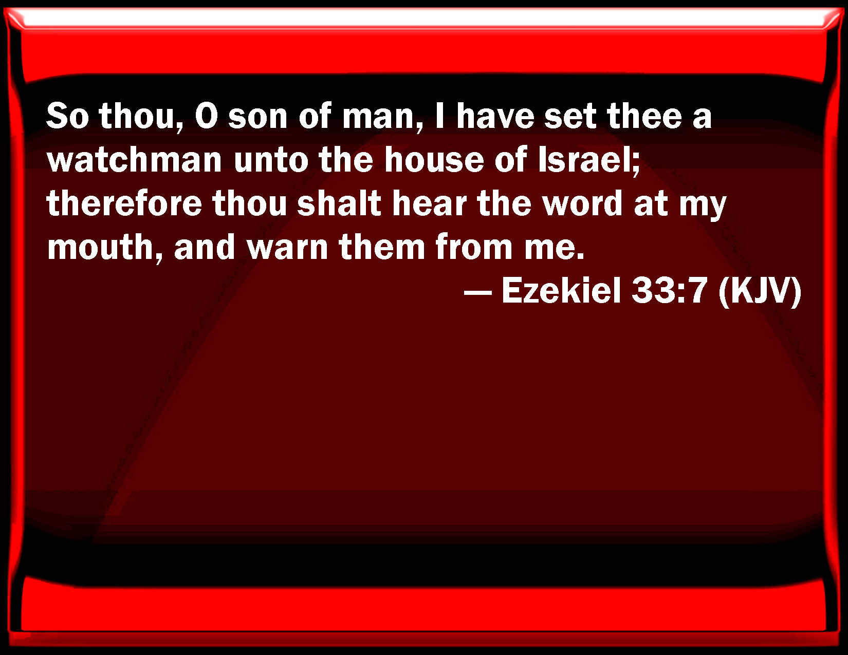 Bible Verse Slide Ezekiel 33:7 So you, O son of man, I have set you a watchman to the house of Israel; therefore you shall hear the word at my mouth, and warn them from me. KJV: So thou, O son of man, I have set thee a watchman unto the house of Israel; therefore thou shalt hear the word at my mouth, and warn them from me. DRB: So thou, O son of man, I have made thee a watchman to the house of Israel: therefore thou shalt hear the word from my mouth, and shalt tell it them from me. DBT: So thou, son of man, I have set thee a watchman unto the house of Israel; and thou shalt hear the word from my mouth, and warn them from me. ERV: So thou, son of man, I have set thee a watchman unto the house of Israel; therefore hear the word at my mouth, and give them warning from me. WBT: So thou, O son of man, I have set thee a watchman to the house of Israel; therefore thou shalt hear the word at my mouth, and warn them from me. WEB: So you, son of man, I have set you a watchman to the house of Israel; therefore hear the word at my mouth, and give them warning from me. YLT: And thou, son of man, A watchman I gave thee to the house of Israel, And thou hast heard from My mouth a word, And thou hast warned them from Me.Links Ezekiel 33:7 NIV • Ezekiel 33:7 NLT • Ezekiel 33:7 ESV • Ezekiel 33:7 NASB • Ezekiel 33:7 KJV • Ezekiel 33:7 Interlinear • Ezekiel 33:7 Commentaries • Ezekiel 33:7 Parallel Texts • Ezekiel 33:7 Bible Apps • Ezekiel 33:7 Parallel • Bible Hub |