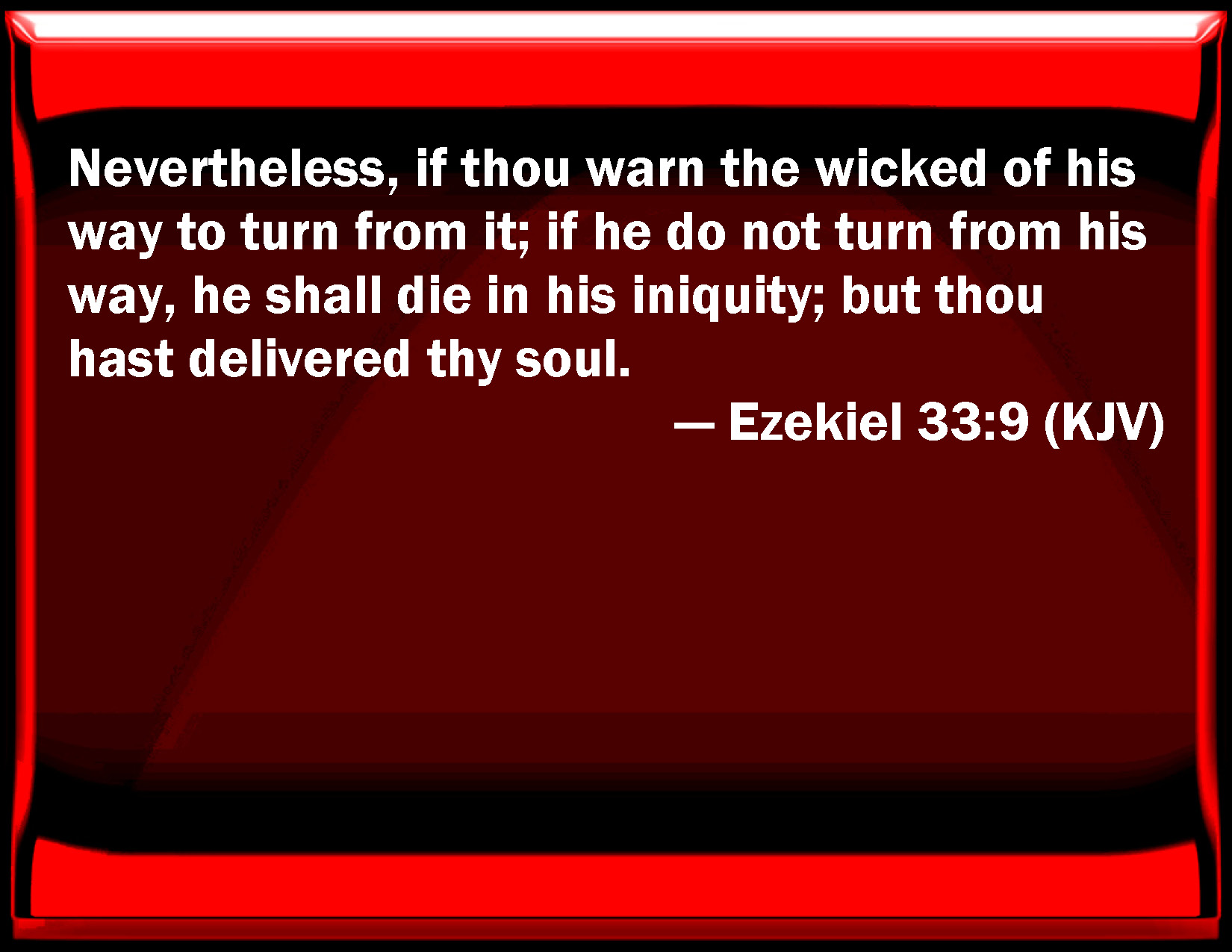 Bible Verse Slide Ezekiel 33:9 Nevertheless, if you warn the wicked of his way to turn from it; if he do not turn from his way, he shall die in his iniquity; but you have delivered your soul. KJV: Nevertheless, if thou warn the wicked of his way to turn from it; if he do not turn from his way, he shall die in his iniquity; but thou hast delivered thy soul. DRB: But if thou tell the wicked man, that he may be converted from his ways, and he be not converted from his way: he shall die in his iniquity: but thou hast delivered thy soul. DBT: But if thou warn the wicked of his way to turn from it, and he do not turn from his way, he shall die in his iniquity; but thou hast delivered thy soul. ERV: Nevertheless, if thou warn the wicked of his way to turn from it, and he turn not from his way; he shall die in his iniquity, but thou hast delivered thy soul. WBT: Nevertheless, if thou shalt warn the wicked of his way to turn from it; if he shall not turn from his way, he shall die in his iniquity; but thou hast delivered thy soul. WEB: Nevertheless, if you warn the wicked of his way to turn from it, and he doesn't turn from his way; he shall die in his iniquity, but you have delivered your soul. YLT: And thou, when thou hast warned the wicked of his way, to turn back from it, And he hath not turned back from his way, He in his iniquity doth die, And thou thy soul hast delivered.Links Ezekiel 33:9 NIV • Ezekiel 33:9 NLT • Ezekiel 33:9 ESV • Ezekiel 33:9 NASB • Ezekiel 33:9 KJV • Ezekiel 33:9 Interlinear • Ezekiel 33:9 Commentaries • Ezekiel 33:9 Parallel Texts • Ezekiel 33:9 Bible Apps • Ezekiel 33:9 Parallel • Bible Hub |