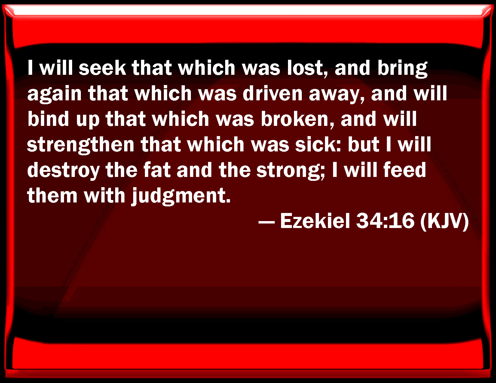 Bible Verse Slide Ezekiel 34:16 I will seek that which was lost, and bring again that which was driven away, and will bind up that which was broken, and will strengthen that which was sick: but I will destroy the fat and the strong; I will feed them with judgment. KJV: I will seek that which was lost, and bring again that which was driven away, and will bind up that which was broken, and will strengthen that which was sick: but I will destroy the fat and the strong; I will feed them with judgment. DRB: I will seek that which was lost: and that which was driven away, I will bring again: and I will bind up that which was broken, and I will strengthen that which was weak, and that which was fat and strong I will preserve: and I will feed them in judgment. DBT: I will seek the lost, and bring again that which was driven away, and will bind up the broken, and will strengthen that which was sick; but I will destroy the fat and the strong: I will feed them with judgment. ERV: I will seek that which was lost, and will bring again that which was driven away, and will bind up that which was broken, and will strengthen that which was sick: and the fat and the strong I will destroy; I will feed them in judgment. WBT: I will seek that which was lost, and bring again that which was driven away, and will bind up that which was broken, and will strengthen that which was sick: but I will destroy the fat and the strong; I will feed them with judgment. WEB: I will seek that which was lost, and will bring back that which was driven away, and will bind up that which was broken, and will strengthen that which was sick: but the fat and the strong I will destroy; I will feed them in justice. YLT: The lost I seek, and the driven away bring back, And the broken I bind up, and the sick I strengthen, And the fat and the strong I destroy, I feed it with judgment.Links Ezekiel 34:16 NIV • Ezekiel 34:16 NLT • Ezekiel 34:16 ESV • Ezekiel 34:16 NASB • Ezekiel 34:16 KJV • Ezekiel 34:16 Interlinear • Ezekiel 34:16 Commentaries • Ezekiel 34:16 Parallel Texts • Ezekiel 34:16 Bible Apps • Ezekiel 34:16 Parallel • Bible Hub |