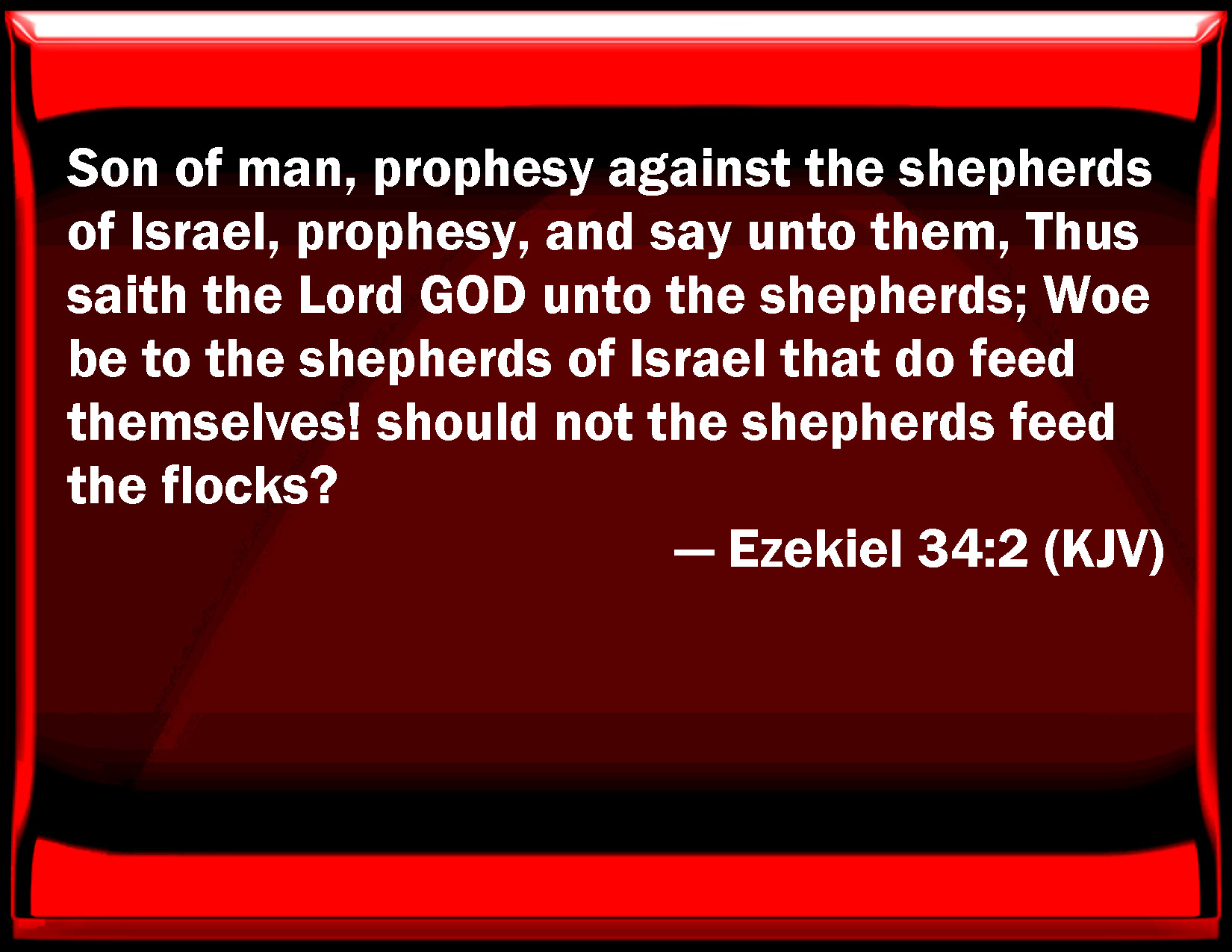 Bible Verse Slide Ezekiel 34:2 Son of man, prophesy against the shepherds of Israel, prophesy, and say to them, Thus said the Lord GOD to the shepherds; Woe be to the shepherds of Israel that do feed themselves! should not the shepherds feed the flocks? KJV: Son of man, prophesy against the shepherds of Israel, prophesy, and say unto them, Thus saith the Lord GOD unto the shepherds; Woe be to the shepherds of Israel that do feed themselves! should not the shepherds feed the flocks? DRB: Son of man, prophesy concerning the shepherds of Israel: prophesy, and say to the shepherds: Thus saith the Lord God: Woe to the shepherds of Israel, that fed themselves: should not the hocks be fed by the shepherds? DBT: Son of man, prophesy against the shepherds of Israel, prophesy; and say unto them, unto the shepherds, Thus saith the Lord Jehovah: Woe to the shepherds of Israel that feed themselves! Should not the shepherds feed the flock? ERV: Son of man, prophesy against the shepherds of Israel, prophesy, and say unto them, even to the shepherds, Thus saith the Lord GOD: Woe unto the shepherds of Israel that do feed themselves! should not the shepherds feed the sheep? WBT: Son of man, prophesy against the shepherds of Israel, prophesy, and say to them, Thus saith the Lord GOD to the shepherds; Woe be to the shepherds of Israel that do feed themselves! should not the shepherds feed the flocks? WEB: Son of man, prophesy against the shepherds of Israel, prophesy, and tell them, even to the shepherds, Thus says the Lord Yahweh: Woe to the shepherds of Israel who feed themselves! Shouldn't the shepherds feed the sheep? YLT: Son of man, prophesy concerning shepherds of Israel, prophesy, and thou hast said unto them: To the shepherds, thus said the Lord Jehovah: Woe to the shepherds of Israel, Who have been feeding themselves! The flock do not the shepherds feed?Links Ezekiel 34:2 NIV • Ezekiel 34:2 NLT • Ezekiel 34:2 ESV • Ezekiel 34:2 NASB • Ezekiel 34:2 KJV • Ezekiel 34:2 Interlinear • Ezekiel 34:2 Commentaries • Ezekiel 34:2 Parallel Texts • Ezekiel 34:2 Bible Apps • Ezekiel 34:2 Parallel • Bible Hub |