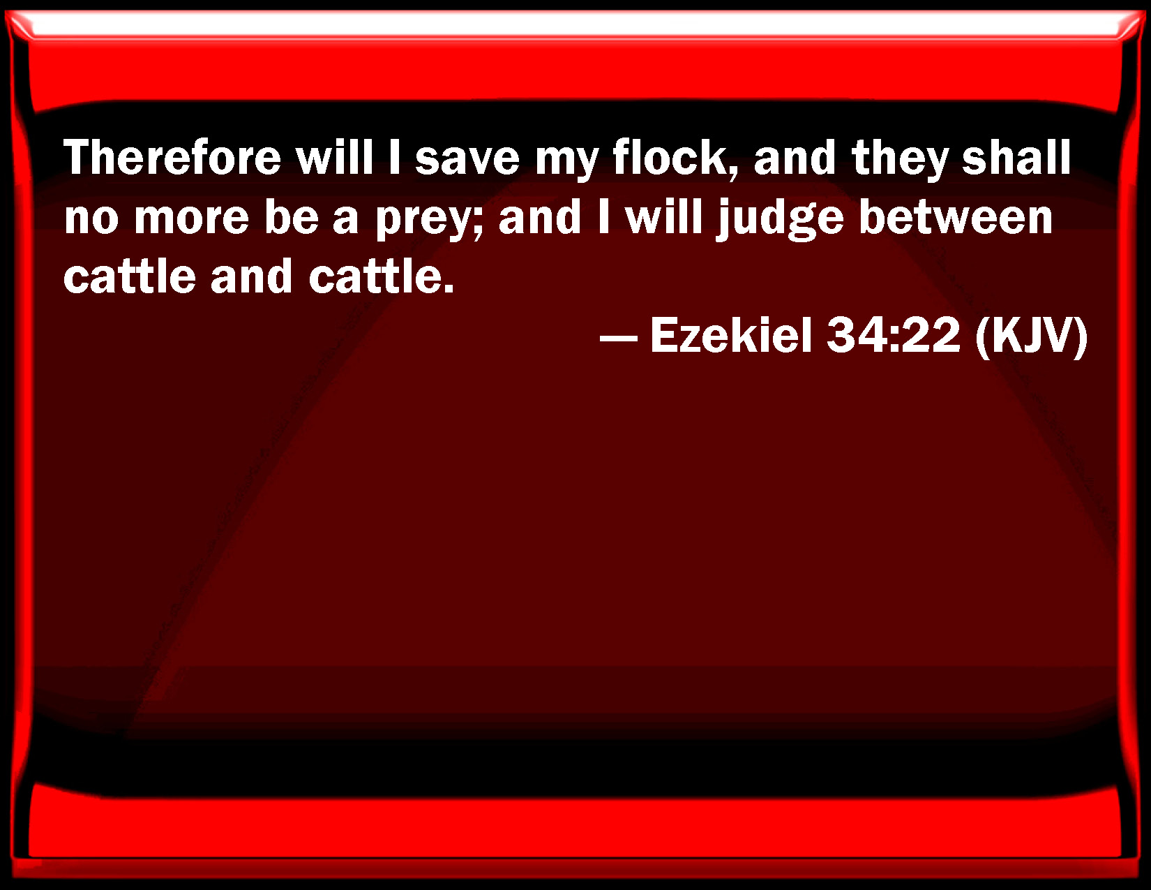 Bible Verse Slide Ezekiel 34:22 Therefore will I save my flock, and they shall no more be a prey; and I will judge between cattle and cattle. KJV: Therefore will I save my flock, and they shall no more be a prey; and I will judge between cattle and cattle. DRB: I will save my dock, and it shall be no more a spoil, and I will judge between cattle and cattle. DBT: I will save my flock, that they may no more be a prey; and I will judge between sheep and sheep. ERV: therefore will I save my flock, and they shall no more be a prey; and I will judge between cattle and cattle. WBT: Therefore will I save my flock, and they shall no more be a prey; and I will judge between cattle and cattle. WEB: therefore will I save my flock, and they shall no more be a prey; and I will judge between sheep and sheep. YLT: And I have given safety to My flock, And they are not any more for prey, And I have judged between sheep and sheep.Links Ezekiel 34:22 NIV • Ezekiel 34:22 NLT • Ezekiel 34:22 ESV • Ezekiel 34:22 NASB • Ezekiel 34:22 KJV • Ezekiel 34:22 Interlinear • Ezekiel 34:22 Commentaries • Ezekiel 34:22 Parallel Texts • Ezekiel 34:22 Bible Apps • Ezekiel 34:22 Parallel • Bible Hub |