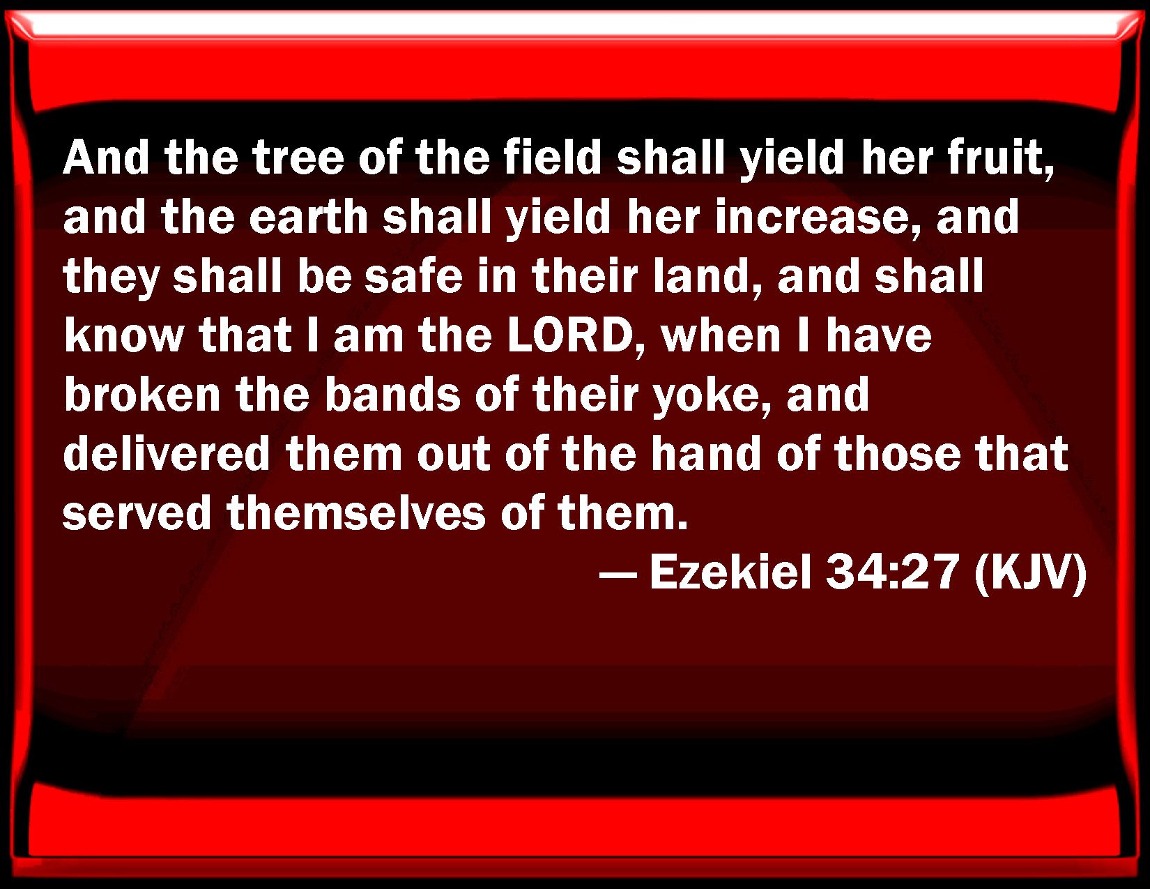 Bible Verse Slide Ezekiel 34:27 And the tree of the field shall yield her fruit, and the earth shall yield her increase, and they shall be safe in their land, and shall know that I am the LORD, when I have broken the bands of their yoke, and delivered them out of the hand of those that served themselves of them. KJV: And the tree of the field shall yield her fruit, and the earth shall yield her increase, and they shall be safe in their land, and shall know that I am the LORD, when I have broken the bands of their yoke, and delivered them out of the hand of those that served themselves of them. DRB: And the tree of the field shall yield its fruit, and the earth shall yield her increase, and they shall be in their land without fear: and they shall know that I am the Lord, when I shall have broken the bonds of their yoke, and shall have delivered them out of the hand of those that rule over them. DBT: And the tree of the field shall yield its fruit, and the earth shall yield its increase; and they shall be in safety in their land, and shall know that I am Jehovah, when I have broken the bands of their yoke and delivered them out of the hand of those that kept them in servitude. ERV: And the tree of the field shall yield its fruit, and the earth shall yield her increase, and they shall be secure in their land; and they shall know that I am the LORD, when I have broken the bars of their yoke, and have delivered them out of the hand of those that served themselves of them. WBT: And the tree of the field shall yield her fruit, and the earth shall yield her increase, and they shall be safe in their land, and shall know that I am the LORD, when I have broken the bands of their yoke, and delivered them out of the hand of those that subjected them to service. WEB: The tree of the field shall yield its fruit, and the earth shall yield its increase, and they shall be secure in their land; and they shall know that I am Yahweh, when I have broken the bars of their yoke, and have delivered them out of the hand of those who made slaves of them. YLT: And given hath the tree of the field its fruit, And the land doth give her increase, And they have been on their land confident, And they have known that I am Jehovah, In My breaking the bands of their yoke, And I have delivered them from the hand of those laying service on them.Links Ezekiel 34:27 NIV • Ezekiel 34:27 NLT • Ezekiel 34:27 ESV • Ezekiel 34:27 NASB • Ezekiel 34:27 KJV • Ezekiel 34:27 Interlinear • Ezekiel 34:27 Commentaries • Ezekiel 34:27 Parallel Texts • Ezekiel 34:27 Bible Apps • Ezekiel 34:27 Parallel • Bible Hub |
