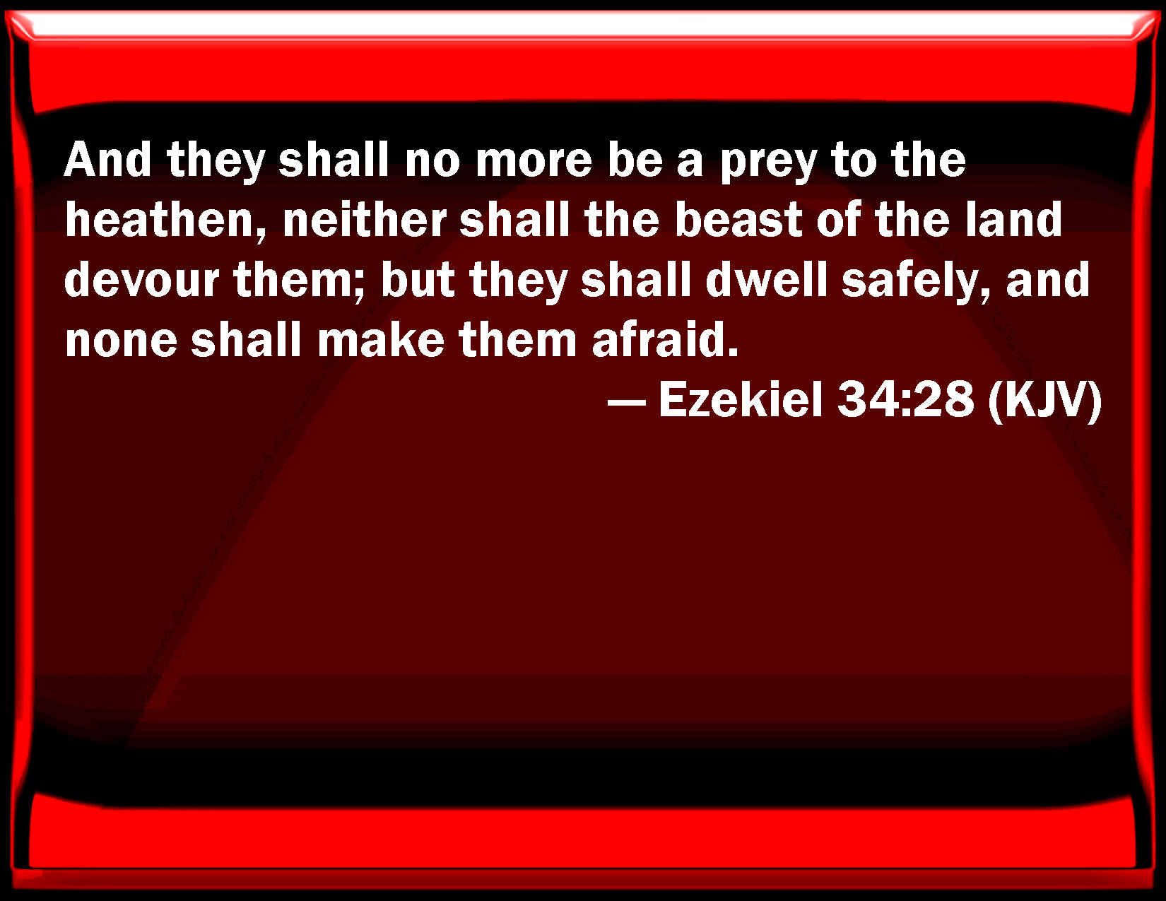 Bible Verse Slide Ezekiel 34:28 And they shall no more be a prey to the heathen, neither shall the beast of the land devour them; but they shall dwell safely, and none shall make them afraid. KJV: And they shall no more be a prey to the heathen, neither shall the beast of the land devour them; but they shall dwell safely, and none shall make them afraid. DRB: And they shall be no more for a spoil to the nations, neither shall the beasts of the earth devour them: but they shall dwell securely without any terror. DBT: And they shall no more be a prey to the nations, neither shall the beast of the earth devour them; but they shall dwell in safety, and none shall make them afraid. ERV: And they shall no more be a prey to the heathen, neither shall the beast of the earth devour them; but they shall dwell securely, and none shall make them afraid. WBT: And they shall no more be a prey to the heathen, neither shall the beast of the land devour them; but they shall dwell safely, and none shall make them afraid. WEB: They shall no more be a prey to the nations, neither shall the animals of the earth devour them; but they shall dwell securely, and none shall make them afraid. YLT: And they are no more a prey to nations, And the beast of the earth devoureth them not, And they have dwelt confidently, And there is none troubling.Links Ezekiel 34:28 NIV • Ezekiel 34:28 NLT • Ezekiel 34:28 ESV • Ezekiel 34:28 NASB • Ezekiel 34:28 KJV • Ezekiel 34:28 Interlinear • Ezekiel 34:28 Commentaries • Ezekiel 34:28 Parallel Texts • Ezekiel 34:28 Bible Apps • Ezekiel 34:28 Parallel • Bible Hub |