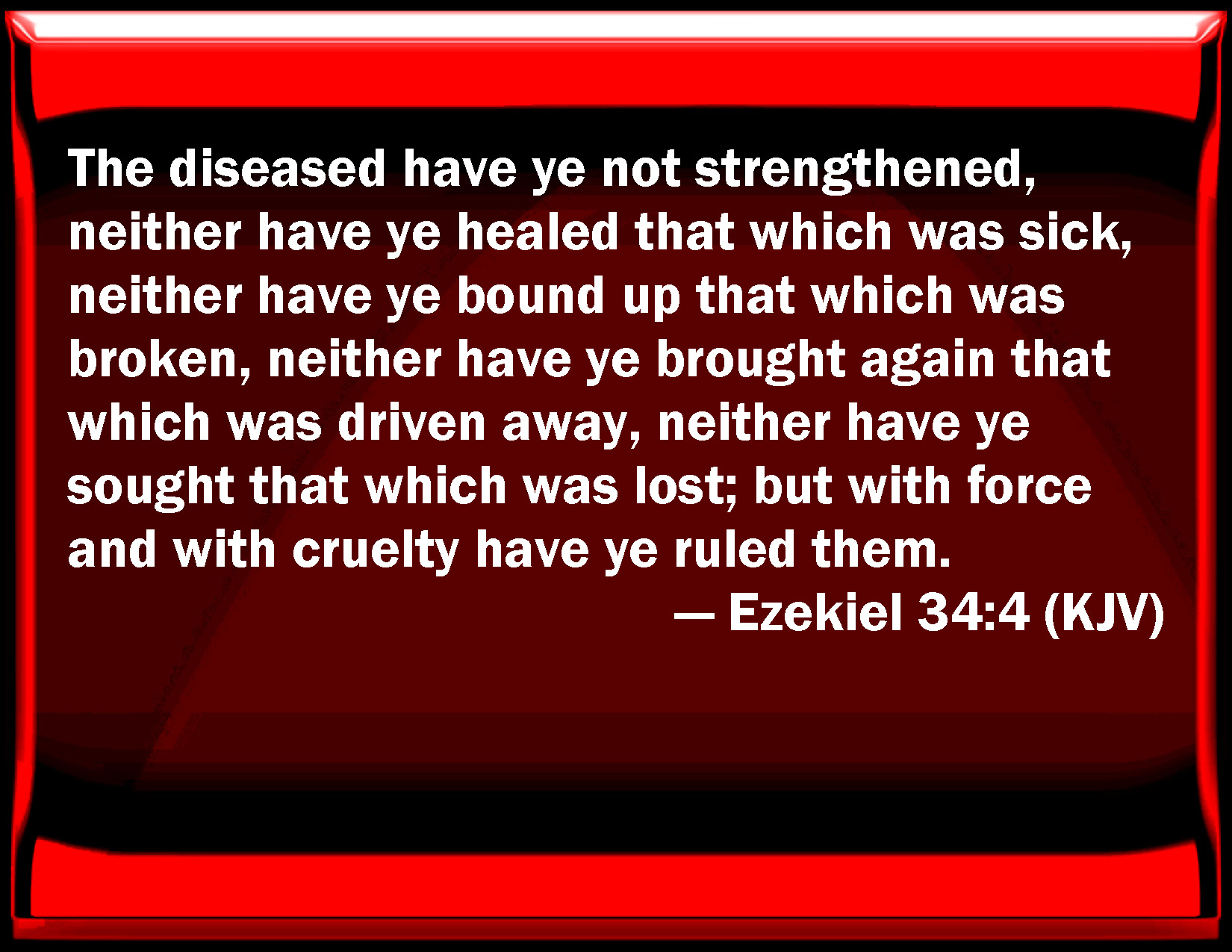 Bible Verse Slide Ezekiel 34:4 The diseased have you not strengthened, neither have you healed that which was sick, neither have you bound up that which was broken, neither have you brought again that which was driven away, neither have you sought that which was lost; but with force and with cruelty have you ruled them. KJV: The diseased have ye not strengthened, neither have ye healed that which was sick, neither have ye bound up that which was broken, neither have ye brought again that which was driven away, neither have ye sought that which was lost; but with force and with cruelty have ye ruled them. DRB: The weak you have not strengthened, and that which was sick you have not healed, that which was broken you have not bound up, and that which was driven away you have not brought again, neither have you sought that which was lost: but you ruled over them with rigour, and with a high hand. DBT: The weak have ye not strengthened, nor have ye healed the sick, and ye have not bound up what was broken, neither have ye brought again that which was driven away, neither have ye sought for that which was lost; but with harshness and with rigour have ye ruled over them. ERV: The diseased have ye not strengthened, neither have ye healed that which was sick, neither have ye bound up that which was broken, neither have ye brought again that which was driven away, neither have ye sought that which was lost; but with force and with rigour have ye ruled over them. WBT: The diseased ye have not strengthened, neither have ye healed that which was sick, neither have ye bound up that which was broken, neither have ye brought again that which was driven away, neither have ye sought that which was lost; but with force and with cruelty have ye ruled them. WEB: You haven't strengthened the diseased, neither have you healed that which was sick, neither have you bound up that which was broken, neither have you brought back that which was driven away, neither have you sought that which was lost; but with force and with rigor you have ruled over them. YLT: The weak ye have not strengthened, And the sick one ye have not healed, And the broken ye have not bound up, And the driven away have not brought back, And the lost ye have not sought, And with might ye have ruled them and with rigour.Links Ezekiel 34:4 NIV • Ezekiel 34:4 NLT • Ezekiel 34:4 ESV • Ezekiel 34:4 NASB • Ezekiel 34:4 KJV • Ezekiel 34:4 Interlinear • Ezekiel 34:4 Commentaries • Ezekiel 34:4 Parallel Texts • Ezekiel 34:4 Bible Apps • Ezekiel 34:4 Parallel • Bible Hub |
