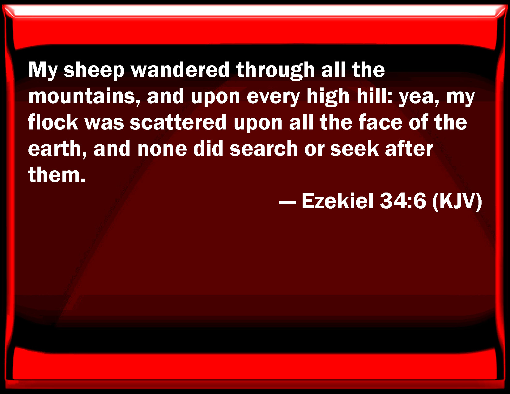 Bible Verse Slide Ezekiel 34:6 My sheep wandered through all the mountains, and on every high hill: yes, my flock was scattered on all the face of the earth, and none did search or seek after them. KJV: My sheep wandered through all the mountains, and upon every high hill: yea, my flock was scattered upon all the face of the earth, and none did search or seek after them. DRB: My sheep have wandered in every mountain, and in every high hill: and my flocks mere scattered upon the face of the earth, and there was none that sought them, there was none, I say, that sought them. DBT: My sheep wandered through all the mountains, and upon every high hill, and my sheep have been scattered upon all the face of the earth, and there was none that searched, or that sought for them. ERV: My sheep wandered through all the mountains, and upon every high hill: yea, my sheep were scattered upon all the face of the earth; and there was none that did search or seek after them. WBT: My sheep wandered through all the mountains, and upon every high hill: yes, my flock was scattered upon all the face of the earth, and none did search or seek for them. WEB: My sheep wandered through all the mountains, and on every high hill: yes, my sheep were scattered on all the surface of the earth; and there was none who searched or sought. YLT: Go astray do My flock on all the mountains, And on every high hill, And on all the face of the land have My flock been scattered, And there is none inquiring, and none seeking.Links Ezekiel 34:6 NIV • Ezekiel 34:6 NLT • Ezekiel 34:6 ESV • Ezekiel 34:6 NASB • Ezekiel 34:6 KJV • Ezekiel 34:6 Interlinear • Ezekiel 34:6 Commentaries • Ezekiel 34:6 Parallel Texts • Ezekiel 34:6 Bible Apps • Ezekiel 34:6 Parallel • Bible Hub |