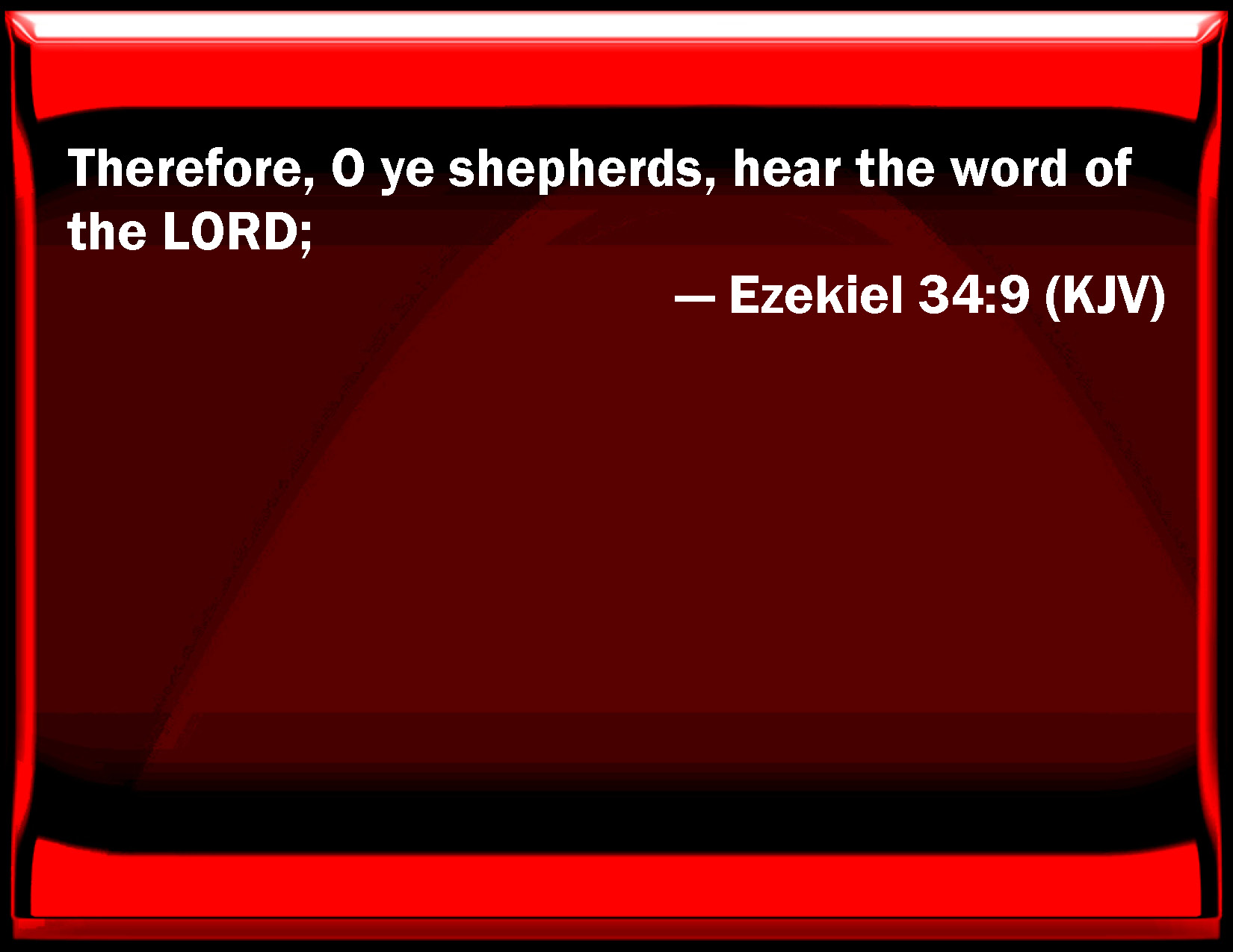 Bible Verse Slide Ezekiel 34:9 Therefore, O you shepherds, hear the word of the LORD; KJV: Therefore, O ye shepherds, hear the word of the LORD; DRB: Therefore, ye shepherds, hear the word of the Lord: DBT: therefore, ye shepherds, Hear the word of Jehovah. ERV: therefore, ye shepherds, hear the word of the LORD; WBT: Therefore, O ye shepherds, hear the word of the LORD; WEB: therefore, you shepherds, hear the word of Yahweh: YLT: Therefore, O shepherds, hear a word of Jehovah:Links Ezekiel 34:9 NIV • Ezekiel 34:9 NLT • Ezekiel 34:9 ESV • Ezekiel 34:9 NASB • Ezekiel 34:9 KJV • Ezekiel 34:9 Interlinear • Ezekiel 34:9 Commentaries • Ezekiel 34:9 Parallel Texts • Ezekiel 34:9 Bible Apps • Ezekiel 34:9 Parallel • Bible Hub |