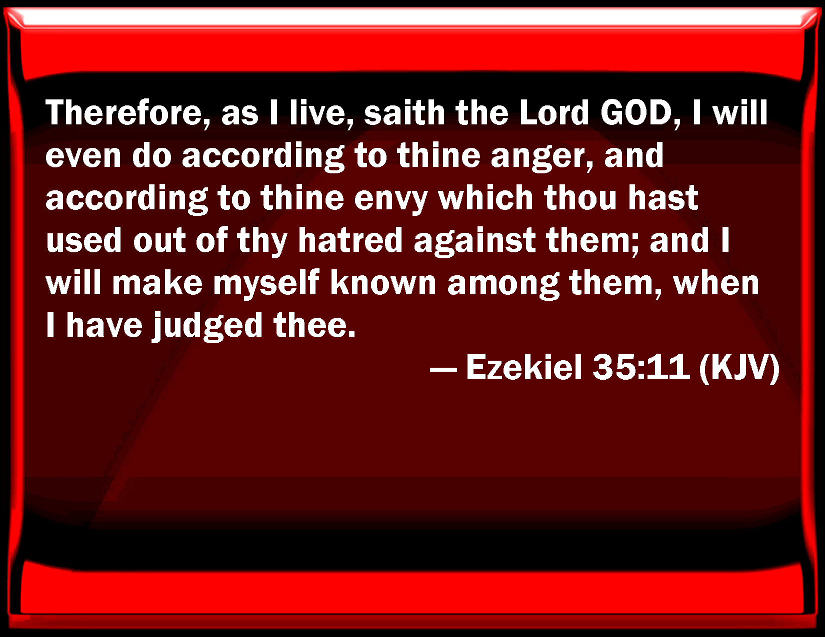 Bible Verse Slide Ezekiel 35:11 Therefore, as I live, said the Lord GOD, I will even do according to your anger, and according to your envy which you have used out of your hatred against them; and I will make myself known among them, when I have judged you. KJV: Therefore, as I live, saith the Lord GOD, I will even do according to thine anger, and according to thine envy which thou hast used out of thy hatred against them; and I will make myself known among them, when I have judged thee. DRB: Therefore as I live, saith the Lord God, I will do according to thy wrath, and according to thy envy, which thou hast exercised in hatred to them: and I will be made known by them, when I shall have judged thee. DBT: therefore, as I live, saith the Lord Jehovah, I will even do according to thine anger and according to thine envy, as thou hast done out of thy hatred against them; and I will make myself known among them, when I shall judge thee. ERV: therefore, as I live, saith the Lord GOD, I will do according to thine anger, and according to thine envy which thou hast shewed out of thy hatred against them; and I will make myself known among them, when I shall judge thee. WBT: Therefore, as I live, saith the Lord GOD, I will even do according to thy anger, and according to thy envy which thou hast used out of thy hatred against them; and I will make myself known among them, when I have judged thee. WEB: therefore, as I live, says the Lord Yahweh, I will do according to your anger, and according to your envy which you have shown out of your hatred against them; and I will make myself known among them, when I shall judge you. YLT: Therefore, I live — an affirmation of the Lord Jehovah, And I have done according to thine anger, And according to thine envy, With which thou hast wrought, Because of thy hatred against them, And I have been known among them when I judge thee.Links Ezekiel 35:11 NIV • Ezekiel 35:11 NLT • Ezekiel 35:11 ESV • Ezekiel 35:11 NASB • Ezekiel 35:11 KJV • Ezekiel 35:11 Interlinear • Ezekiel 35:11 Commentaries • Ezekiel 35:11 Parallel Texts • Ezekiel 35:11 Bible Apps • Ezekiel 35:11 Parallel • Bible Hub |