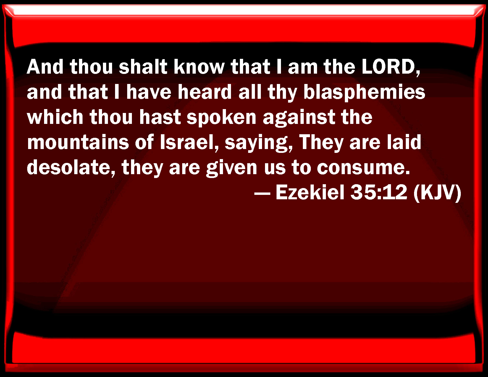 Bible Verse Slide Ezekiel 35:12 And you shall know that I am the LORD, and that I have heard all your blasphemies which you have spoken against the mountains of Israel, saying, They are laid desolate, they are given us to consume. KJV: And thou shalt know that I am the LORD, and that I have heard all thy blasphemies which thou hast spoken against the mountains of Israel, saying, They are laid desolate, they are given us to consume. DRB: And thou shalt know that I the Lord have heard all thy reproaches, that thou hast spoken against the mountains of Israel, saying: They are desolate, they are given to us to consume. DBT: And thou shalt know that I Jehovah have heard all thy reproaches, which thou hast uttered against the mountains of Israel, saying, They are laid desolate, they are given us to devour. ERV: And thou shalt know that I the LORD have heard all thy blasphemies which thou hast spoken against the mountains of Israel, saying, They are laid desolate, they are given us to devour. WBT: And thou shalt know that I am the LORD, and that I have heard all thy blasphemies which thou hast spoken against the mountains of Israel, saying, They are laid desolate, they are given us to consume. WEB: You shall know that I, Yahweh, have heard all your insults which you have spoken against the mountains of Israel, saying, They are laid desolate, they have been given us to devour. YLT: And thou hast known that I — Jehovah, I have heard all thy despisings that thou hast spoken Against mountains of Israel, saying: A desolation, to us they were given for food.Links Ezekiel 35:12 NIV • Ezekiel 35:12 NLT • Ezekiel 35:12 ESV • Ezekiel 35:12 NASB • Ezekiel 35:12 KJV • Ezekiel 35:12 Interlinear • Ezekiel 35:12 Commentaries • Ezekiel 35:12 Parallel Texts • Ezekiel 35:12 Bible Apps • Ezekiel 35:12 Parallel • Bible Hub |