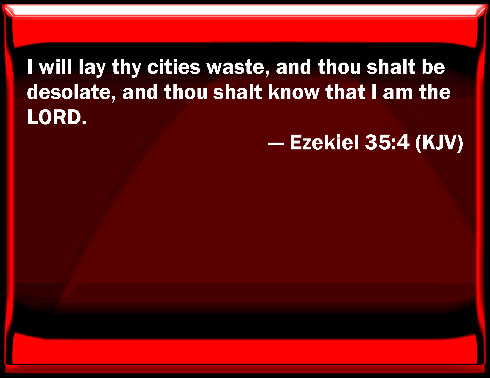 Bible Verse Slide Ezekiel 35:4 I will lay your cities waste, and you shall be desolate, and you shall know that I am the LORD. KJV: I will lay thy cities waste, and thou shalt be desolate, and thou shalt know that I am the LORD. DRB: I will destroy thy cities, and thou shalt be desolate: and thou shalt know that I am the Lord. DBT: I will lay thy cities waste, and thou shalt be a desolation: and thou shalt know that I am Jehovah. ERV: I will lay thy cities waste, and thou shalt be desolate; and thou shalt know that I am the LORD. WBT: I will lay thy cities waste, and thou shalt be desolate, and thou shalt know that I am the LORD. WEB: I will lay your cities waste, and you shall be desolate; and you shall know that I am Yahweh. YLT: Thy cities a waste I make, and thou art a desolation, And thou hast known that I am Jehovah.Links Ezekiel 35:4 NIV • Ezekiel 35:4 NLT • Ezekiel 35:4 ESV • Ezekiel 35:4 NASB • Ezekiel 35:4 KJV • Ezekiel 35:4 Interlinear • Ezekiel 35:4 Commentaries • Ezekiel 35:4 Parallel Texts • Ezekiel 35:4 Bible Apps • Ezekiel 35:4 Parallel • Bible Hub |