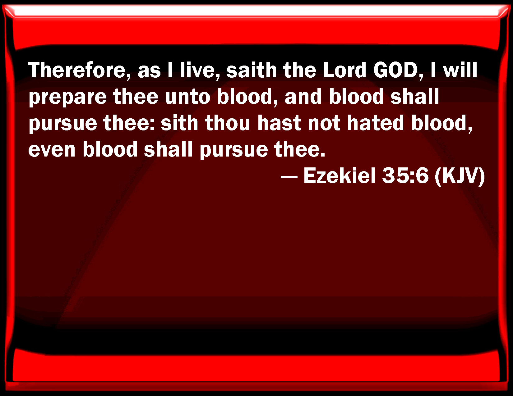 Bible Verse Slide Ezekiel 35:6 Therefore, as I live, said the Lord GOD, I will prepare you to blood, and blood shall pursue you: since you have not hated blood, even blood shall pursue you. KJV: Therefore, as I live, saith the Lord GOD, I will prepare thee unto blood, and blood shall pursue thee: sith thou hast not hated blood, even blood shall pursue thee. DRB: Therefore as I live, saith the Lord God, I will deliver thee up to blood, and blood shall pursue thee: and whereas thou hast hated blood, blood shall pursue thee. DBT: therefore, as I live, saith the Lord Jehovah, I will certainly appoint thee unto blood, and blood shall pursue thee; since thou hast not hated blood, blood shall pursue thee. ERV: therefore, as I live, saith the Lord GOD, I will prepare thee unto blood, and blood shall pursue thee: sith thou hast not hated blood, therefore blood shall pursue thee. WBT: Therefore, as I live, saith the Lord GOD, I will prepare thee to blood, and blood shall pursue thee: since thou hast not hated blood, even blood shall pursue thee. WEB: therefore, as I live, says the Lord Yahweh, I will prepare you for blood, and blood shall pursue you: since you have not hated blood, therefore blood shall pursue you. YLT: Therefore, I live — an affirmation of the Lord Jehovah, Surely for blood I do appoint thee, And blood doth pursue thee, If blood thou hast not hated, Blood also doth pursue thee.Links Ezekiel 35:6 NIV • Ezekiel 35:6 NLT • Ezekiel 35:6 ESV • Ezekiel 35:6 NASB • Ezekiel 35:6 KJV • Ezekiel 35:6 Interlinear • Ezekiel 35:6 Commentaries • Ezekiel 35:6 Parallel Texts • Ezekiel 35:6 Bible Apps • Ezekiel 35:6 Parallel • Bible Hub |