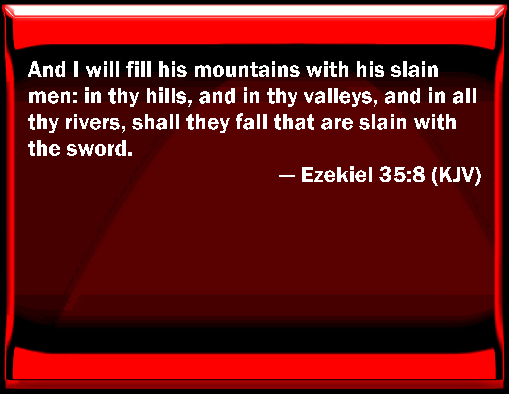 Bible Verse Slide Ezekiel 35:8 And I will fill his mountains with his slain men: in your hills, and in your valleys, and in all your rivers, shall they fall that are slain with the sword. KJV: And I will fill his mountains with his slain men: in thy hills, and in thy valleys, and in all thy rivers, shall they fall that are slain with the sword. DRB: And I will fill his mountains with his men that are slain: in thy hills, and in thy valleys, and in thy torrents they shall fall that are slain with the sword. DBT: and I will fill his mountains with his slain. In thy hills, and in thy valleys, and in all thy water-courses shall they fall that are slain with the sword. ERV: And I will fill his mountains with his slain: in thy hills and in thy valleys and in all thy watercourses shall they fall that are slain with the sword. WBT: And I will fill his mountains with his slain men: in thy hills, and in thy valleys, and in all thy rivers, shall they fall that are slain with the sword. WEB: I will fill its mountains with its slain: in your hills and in your valleys and in all your watercourses shall they fall who are slain with the sword. YLT: And filled his mountains with his wounded, Thy hills, and thy valleys, and all thy streams, The pierced of the sword fall into them.Links Ezekiel 35:8 NIV • Ezekiel 35:8 NLT • Ezekiel 35:8 ESV • Ezekiel 35:8 NASB • Ezekiel 35:8 KJV • Ezekiel 35:8 Interlinear • Ezekiel 35:8 Commentaries • Ezekiel 35:8 Parallel Texts • Ezekiel 35:8 Bible Apps • Ezekiel 35:8 Parallel • Bible Hub |
