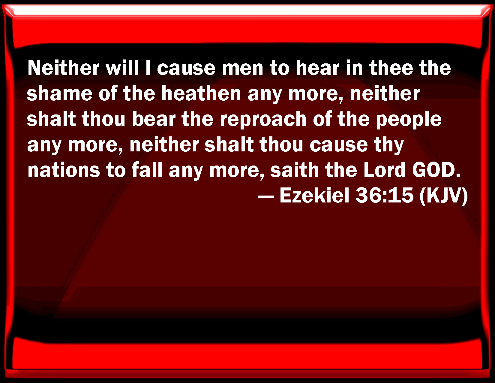 Bible Verse Slide Ezekiel 36:15 Neither will I cause men to hear in you the shame of the heathen any more, neither shall you bear the reproach of the people any more, neither shall you cause your nations to fall any more, said the Lord GOD. KJV: Neither will I cause men to hear in thee the shame of the heathen any more, neither shalt thou bear the reproach of the people any more, neither shalt thou cause thy nations to fall any more, saith the Lord GOD. DRB: Neither will I cause men to hear in thee the shame of the nations any more, nor shalt thou bear the reproach of the people, nor lose thy nation any more, saith the Lord God. DBT: neither will I cause thee to hear the ignominy of the nations any more, and thou shalt not bear the reproach of the peoples any more, neither shalt thou cause thy nation to fall any more, saith the Lord Jehovah. ERV: neither will I let thee hear any more the shame of the heathen, neither shalt thou bear the reproach of the peoples any more, neither shalt thou cause thy nation to stumble any more, saith the Lord GOD. WBT: Neither will I cause men to hear in thee the shame of the heathen any more, neither shalt thou bear the reproach of the people any more, neither shalt thou cause thy nations to fall any more, saith the Lord GOD. WEB: neither will I let you hear any more the shame of the nations, neither shall you bear the reproach of the peoples any more, neither shall you cause your nation to stumble any more, says the Lord Yahweh. YLT: And I proclaim not unto thee any more the shame of the nations, And the reproach of peoples thou bearest no more, And thy nations stumble not any more, An affirmation of the Lord Jehovah.'Links Ezekiel 36:15 NIV • Ezekiel 36:15 NLT • Ezekiel 36:15 ESV • Ezekiel 36:15 NASB • Ezekiel 36:15 KJV • Ezekiel 36:15 Interlinear • Ezekiel 36:15 Commentaries • Ezekiel 36:15 Parallel Texts • Ezekiel 36:15 Bible Apps • Ezekiel 36:15 Parallel • Bible Hub |