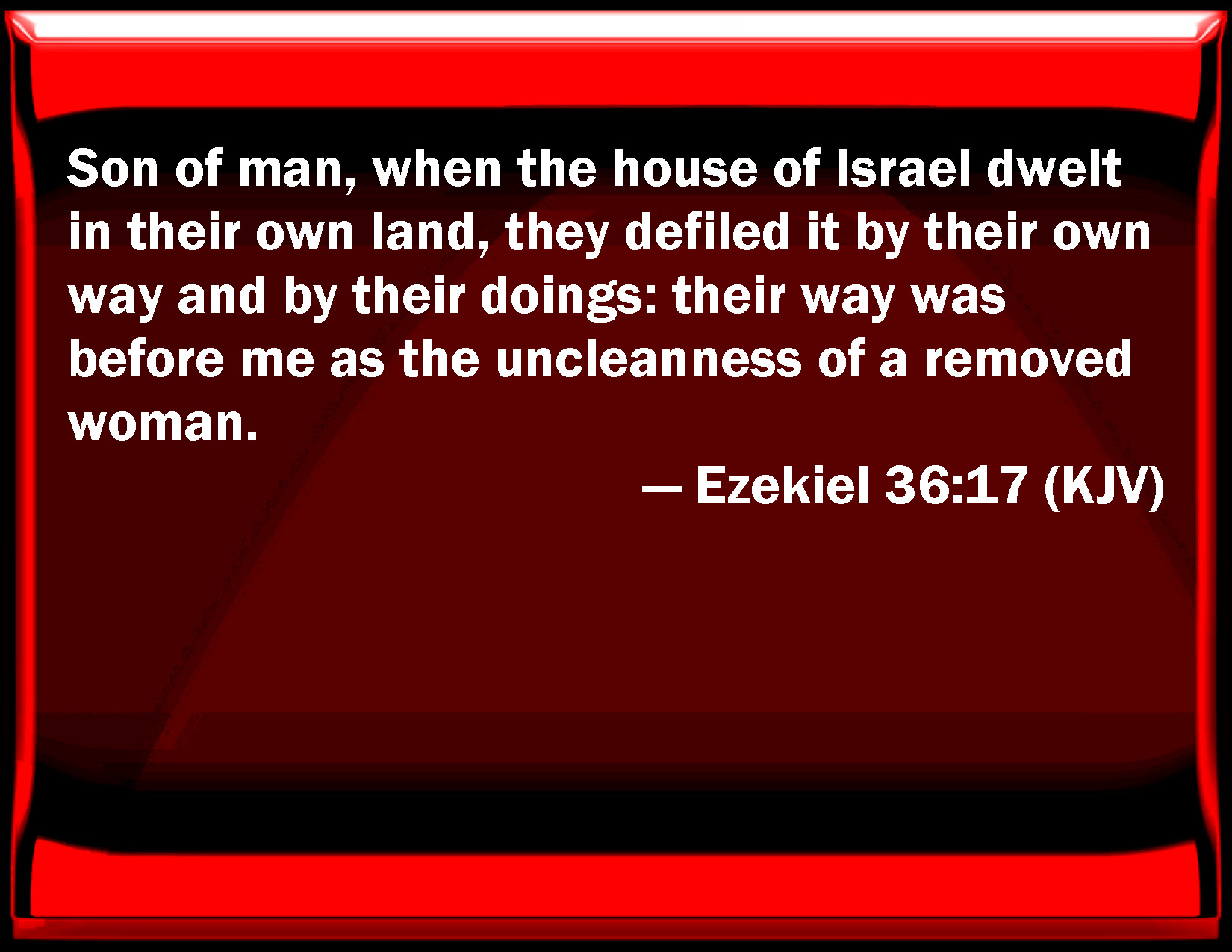 Bible Verse Slide Ezekiel 36:17 Son of man, when the house of Israel dwelled in their own land, they defiled it by their own way and by their doings: their way was before me as the uncleanness of a removed woman. KJV: Son of man, when the house of Israel dwelt in their own land, they defiled it by their own way and by their doings: their way was before me as the uncleanness of a removed woman. DRB: Son of man, when the house of Israel dwelt in their own land, they defiled it with their ways, and with their doings: their way was before me like the uncleanness of a menstruous woman. DBT: Son of man, when the house of Israel dwelt in their own land, they defiled it by their way and by their doings: their way was before me as the uncleanness of a woman in her separation. ERV: Son of man, when the house of Israel dwelt in their own land, they defiled it by their way and by their doings: their way before me was as the uncleanness of a woman in her separation. WBT: Son of man, when the house of Israel dwelt in their own land, they defiled it by their own way and by their doings: their way was before me as the uncleanness of a removed woman. WEB: Son of man, when the house of Israel lived in their own land, they defiled it by their way and by their doings: their way before me was as the uncleanness of a woman in her impurity. YLT: 'Son of man, The house of Israel are dwelling on their land, And they defile it by their way and by their doings, As the uncleanness of a separated one hath their way been before Me.Links Ezekiel 36:17 NIV • Ezekiel 36:17 NLT • Ezekiel 36:17 ESV • Ezekiel 36:17 NASB • Ezekiel 36:17 KJV • Ezekiel 36:17 Interlinear • Ezekiel 36:17 Commentaries • Ezekiel 36:17 Parallel Texts • Ezekiel 36:17 Bible Apps • Ezekiel 36:17 Parallel • Bible Hub |