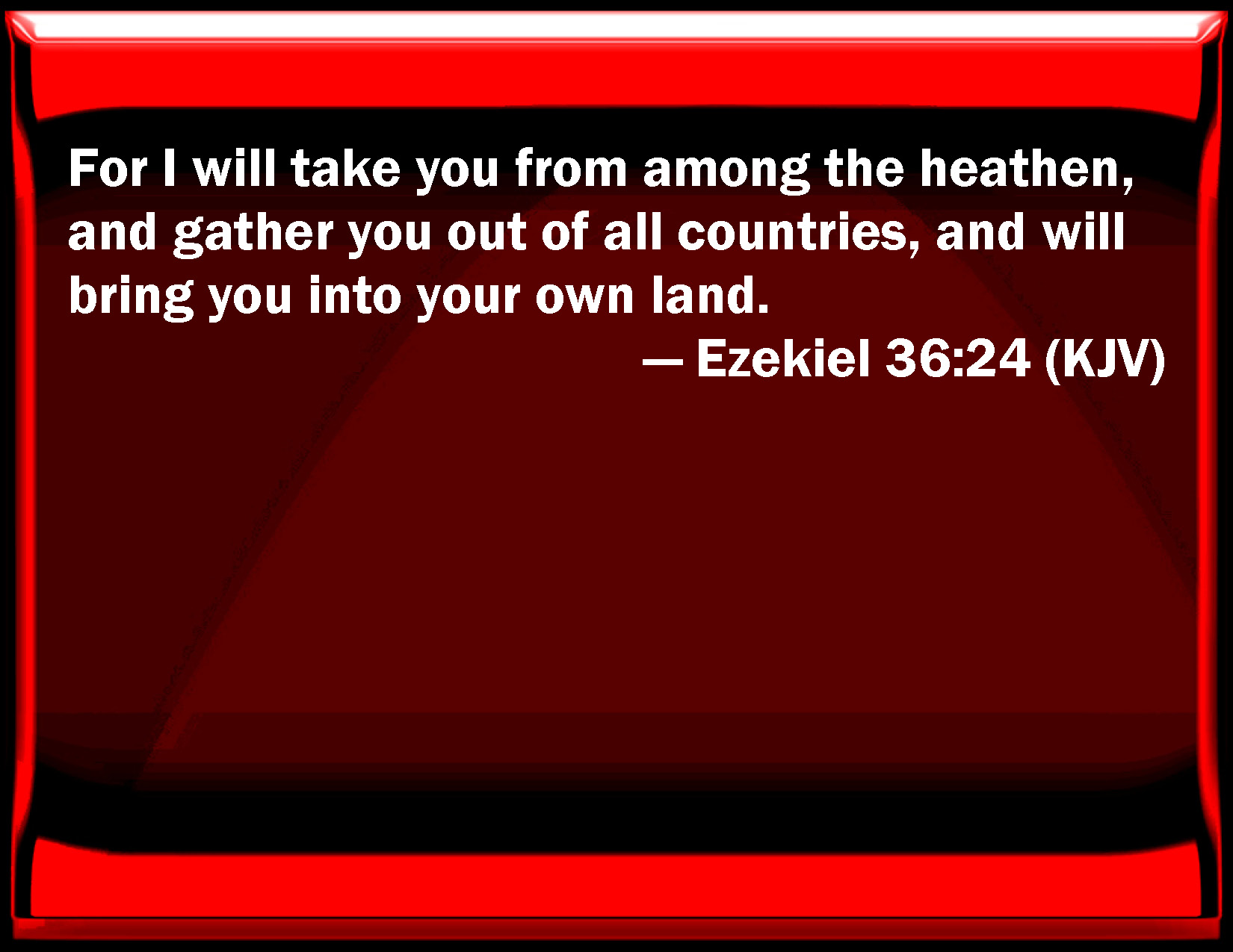 Bible Verse Slide Ezekiel 36:24 For I will take you from among the heathen, and gather you out of all countries, and will bring you into your own land. KJV: For I will take you from among the heathen, and gather you out of all countries, and will bring you into your own land. DRB: For I will take you from among the Gentiles, and will gather you together out of all the countries, and will bring you into your own land. DBT: And I will take you from among the nations, and gather you out of all the countries, and will bring you into your own land. ERV: For I will take you from among the nations, and gather you out of all the countries, and will bring you into your own land. WBT: For I will take you from among the heathen, and gather you out of all countries, and will bring you into your own land. WEB: For I will take you from among the nations, and gather you out of all the countries, and will bring you into your own land. YLT: And I have taken you out of the nations, And have gathered you out of all the lands, And I have brought you in unto your land,Links Ezekiel 36:24 NIV • Ezekiel 36:24 NLT • Ezekiel 36:24 ESV • Ezekiel 36:24 NASB • Ezekiel 36:24 KJV • Ezekiel 36:24 Interlinear • Ezekiel 36:24 Commentaries • Ezekiel 36:24 Parallel Texts • Ezekiel 36:24 Bible Apps • Ezekiel 36:24 Parallel • Bible Hub |