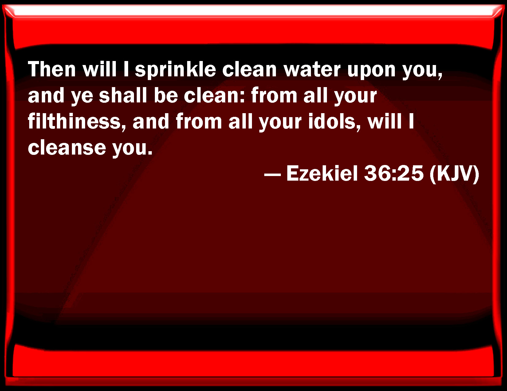 Bible Verse Slide Ezekiel 36:25 Then will I sprinkle clean water on you, and you shall be clean: from all your filthiness, and from all your idols, will I cleanse you. KJV: Then will I sprinkle clean water upon you, and ye shall be clean: from all your filthiness, and from all your idols, will I cleanse you. DRB: And I will pour upon you clean water, and you shall be cleansed from all your filthiness, and I will cleanse you from all your idols. DBT: And I will sprinkle clean water upon you, and ye shall be clean: from all your uncleannesses and from all your idols will I cleanse you. ERV: And I will sprinkle clean water upon you, and ye shall be clean: from all your filthiness, and from all your idols, will I cleanse you. WBT: Then will I sprinkle clean water upon you, and ye shall be clean: from all your filthiness, and from all your idols, will I cleanse you. WEB: I will sprinkle clean water on you, and you shall be clean: from all your filthiness, and from all your idols, will I cleanse you. YLT: And I have sprinkled over you clean water, And ye have been clean; From all your uncleannesses, and from all your idols, I do cleanse you.Links Ezekiel 36:25 NIV • Ezekiel 36:25 NLT • Ezekiel 36:25 ESV • Ezekiel 36:25 NASB • Ezekiel 36:25 KJV • Ezekiel 36:25 Interlinear • Ezekiel 36:25 Commentaries • Ezekiel 36:25 Parallel Texts • Ezekiel 36:25 Bible Apps • Ezekiel 36:25 Parallel • Bible Hub |