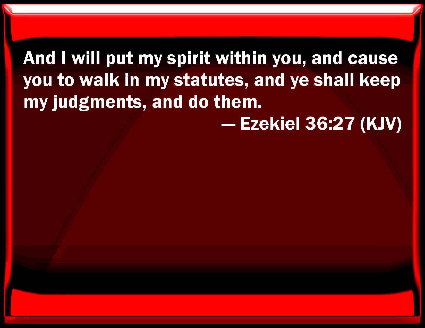Bible Verse Slide Ezekiel 36:27 And I will put my spirit within you, and cause you to walk in my statutes, and you shall keep my judgments, and do them. KJV: And I will put my spirit within you, and cause you to walk in my statutes, and ye shall keep my judgments, and do them. DRB: And I will put my spirit in the midst of you: and I will cause you to walk in my commandments, and to keep my judgments, and do them. DBT: And I will put my Spirit within you, and cause you to walk in my statutes and keep mine ordinances, and ye shall do them. ERV: And I will put my spirit within you, and cause you to walk in my statutes, and ye shall keep my judgments, and do them. WBT: And I will put my spirit within you, and cause you to walk in my statutes, and ye shall keep my judgments, and do them. WEB: I will put my Spirit within you, and cause you to walk in my statutes, and you shall keep my ordinances, and do them. YLT: And My Spirit I give in your midst, And I have done this, so that in My statutes ye walk, And My judgments ye keep, and have done them.Links Ezekiel 36:27 NIV • Ezekiel 36:27 NLT • Ezekiel 36:27 ESV • Ezekiel 36:27 NASB • Ezekiel 36:27 KJV • Ezekiel 36:27 Interlinear • Ezekiel 36:27 Commentaries • Ezekiel 36:27 Parallel Texts • Ezekiel 36:27 Bible Apps • Ezekiel 36:27 Parallel • Bible Hub |