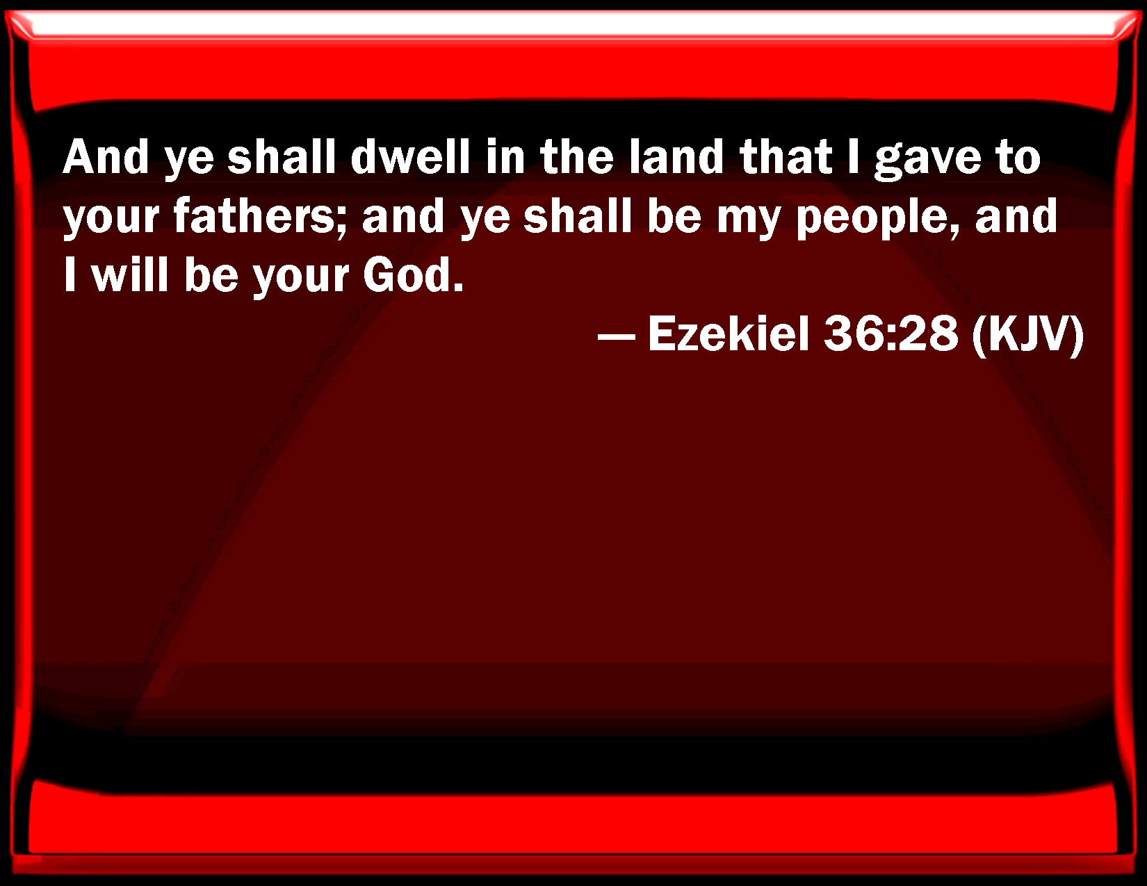 Bible Verse Slide Ezekiel 36:28 And you shall dwell in the land that I gave to your fathers; and you shall be my people, and I will be your God. KJV: And ye shall dwell in the land that I gave to your fathers; and ye shall be my people, and I will be your God. DRB: And you shall dwell in the land which I gave to your fathers, and you shall be my people, and I will be your God. DBT: And ye shall dwell in the land that I gave to your fathers, and ye shall be my people, and I will be your God. ERV: And ye shall dwell in the land that I gave to your fathers; and ye shall be my people, and I will be your God. WBT: And ye shall dwell in the land that I gave to your fathers; and ye shall be my people, and I will be your God. WEB: You shall dwell in the land that I gave to your fathers; and you shall be my people, and I will be your God. YLT: And ye have dwelt in the land that I have given to your fathers, And ye have been to Me for a people, And I — I am to you for God.Links Ezekiel 36:28 NIV • Ezekiel 36:28 NLT • Ezekiel 36:28 ESV • Ezekiel 36:28 NASB • Ezekiel 36:28 KJV • Ezekiel 36:28 Interlinear • Ezekiel 36:28 Commentaries • Ezekiel 36:28 Parallel Texts • Ezekiel 36:28 Bible Apps • Ezekiel 36:28 Parallel • Bible Hub |