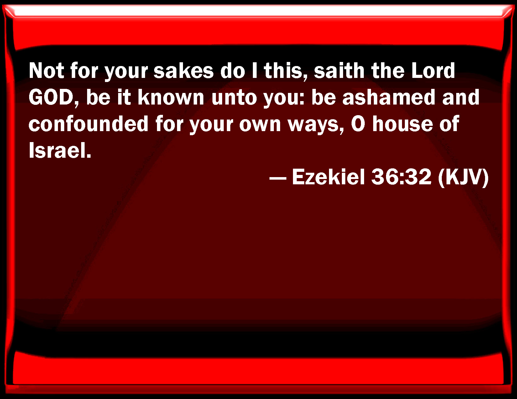 Bible Verse Slide Ezekiel 36:32 Not for your sakes do I this, said the Lord GOD, be it known to you: be ashamed and confounded for your own ways, O house of Israel. KJV: Not for your sakes do I this, saith the Lord GOD, be it known unto you: be ashamed and confounded for your own ways, O house of Israel. DRB: It is not for your sakes that I will do this, saith the Lord God, be it known to you: be confounded, and ashamed at your own ways, O house of Israel. DBT: Not for your sakes do I this, saith the Lord Jehovah, be it known unto you: be ashamed and confounded for your ways, O house of Israel. ERV: Not for your sake do I this, saith the Lord GOD, be it known unto you: be ashamed and confounded for your ways, O house of Israel. WBT: Not for your sakes do I this, saith the Lord GOD, be it known to you: be ashamed and confounded for your own ways, O house of Israel. WEB: Nor for your sake do I [this], says the Lord Yahweh, be it known to you: be ashamed and confounded for your ways, house of Israel. YLT: Not for your sake am I working, An affirmation of the Lord Jehovah, Be it known to you, Be ashamed and confounded, because of your ways, O house of Israel.Links Ezekiel 36:32 NIV • Ezekiel 36:32 NLT • Ezekiel 36:32 ESV • Ezekiel 36:32 NASB • Ezekiel 36:32 KJV • Ezekiel 36:32 Interlinear • Ezekiel 36:32 Commentaries • Ezekiel 36:32 Parallel Texts • Ezekiel 36:32 Bible Apps • Ezekiel 36:32 Parallel • Bible Hub |