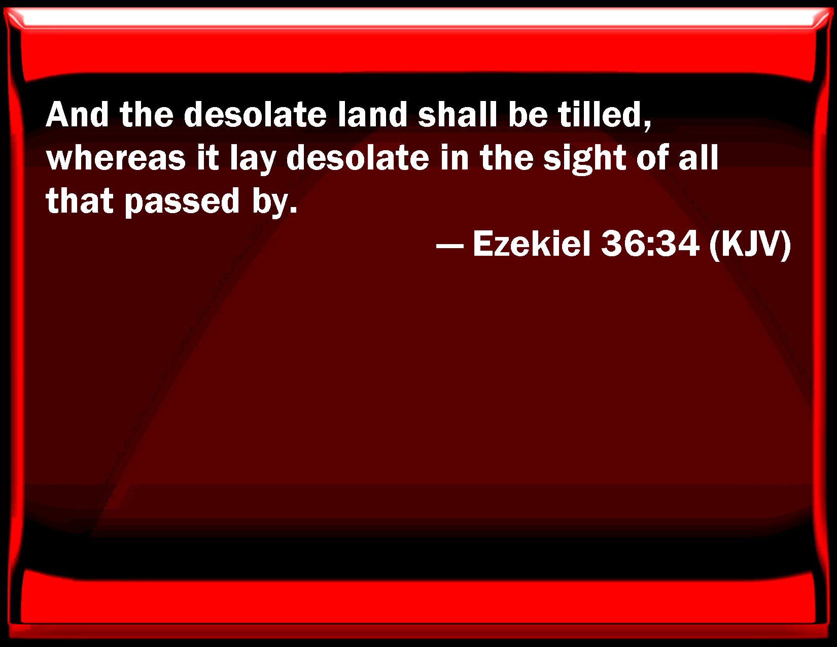 Bible Verse Slide Ezekiel 36:34 And the desolate land shall be tilled, whereas it lay desolate in the sight of all that passed by. KJV: And the desolate land shall be tilled, whereas it lay desolate in the sight of all that passed by. DRB: And the desolate land shall be tilled, which before was waste in the sight of all that passed by, DBT: And the desolate land shall be tilled, whereas it was a desolation in the sight of all that passed by. ERV: And the land that was desolate shall be tilled, whereas it was a desolation in the sight of all that passed by. WBT: And the desolate land shall be tilled, whereas it lay desolate in the sight of all that passed by. WEB: The land that was desolate shall be tilled, whereas it was a desolation in the sight of all who passed by. YLT: And the desolate land is tilled, Instead of which it was a desolation before the eyes of every passer by,Links Ezekiel 36:34 NIV • Ezekiel 36:34 NLT • Ezekiel 36:34 ESV • Ezekiel 36:34 NASB • Ezekiel 36:34 KJV • Ezekiel 36:34 Interlinear • Ezekiel 36:34 Commentaries • Ezekiel 36:34 Parallel Texts • Ezekiel 36:34 Bible Apps • Ezekiel 36:34 Parallel • Bible Hub |