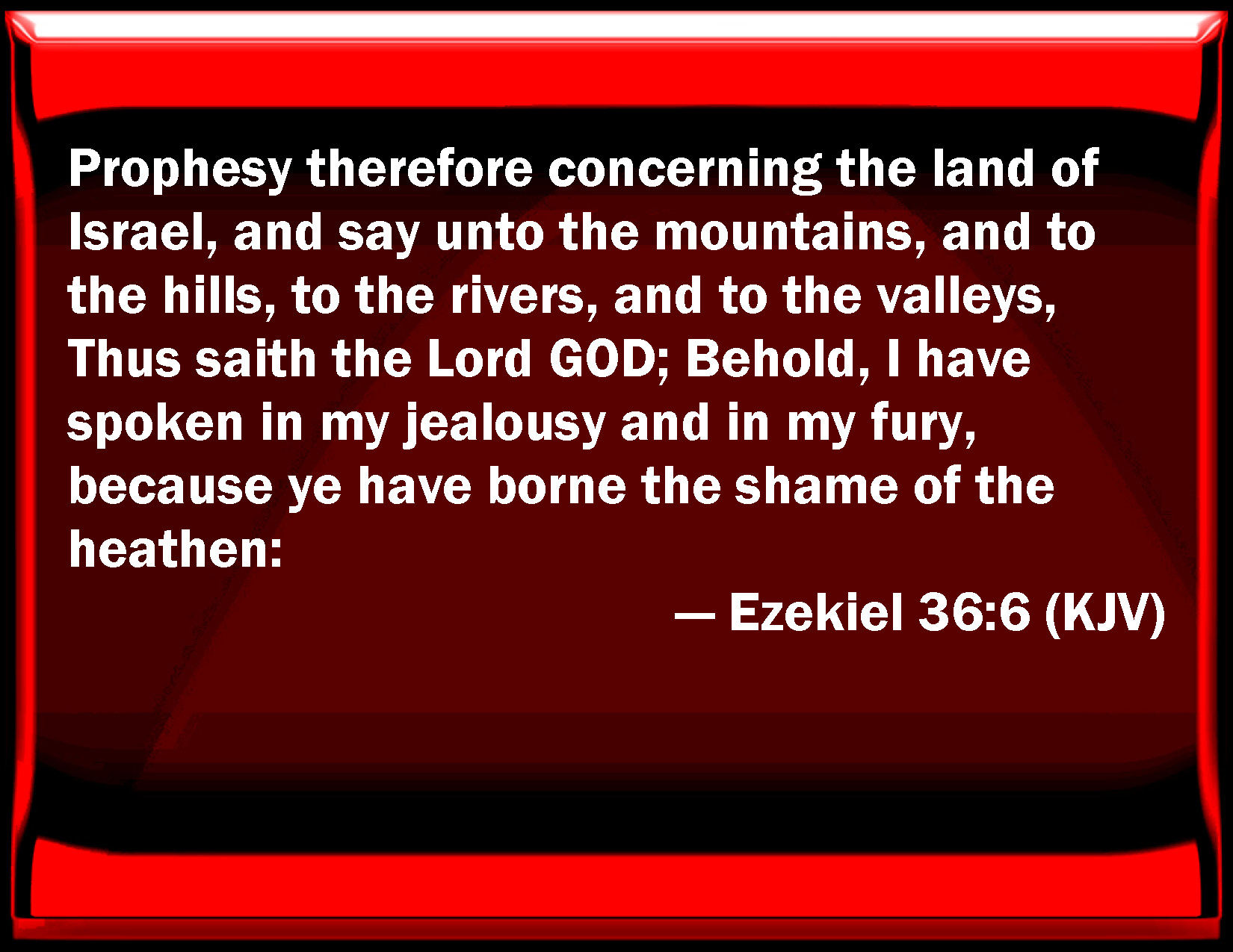 Bible Verse Slide Ezekiel 36:6 Prophesy therefore concerning the land of Israel, and say to the mountains, and to the hills, to the rivers, and to the valleys, Thus said the Lord GOD; Behold, I have spoken in my jealousy and in my fury, because you have borne the shame of the heathen: KJV: Prophesy therefore concerning the land of Israel, and say unto the mountains, and to the hills, to the rivers, and to the valleys, Thus saith the Lord GOD; Behold, I have spoken in my jealousy and in my fury, because ye have borne the shame of the heathen: DRB: Prophesy therefore concerning the land of Israel, and say to the mountains, and to the hills, to the ridges, and to the valleys: Thus saith the Lord God: Behold I have spoken in my zeal, and in my indignation, because you have borne the shame of the Gentiles. DBT: Prophesy therefore concerning the land of Israel, and say to the mountains and to the hills, to the water-courses and to the valleys, Thus saith the Lord Jehovah: Behold, I have spoken in my jealousy and in my fury, because ye have borne the ignominy of the nations; ERV: Therefore prophesy concerning the land of Israel, and say unto the mountains and to the hills, to the watercourses and to the valleys, Thus saith the Lord GOD: Behold, I have spoken in my jealousy and in my fury, because ye have borne the shame of the heathen: WBT: Prophesy therefore concerning the land of Israel, and say to the mountains, and to the hills, to the rivers, and to the valleys, Thus saith the Lord GOD; Behold, I have spoken in my jealousy and in my fury, because ye have borne the shame of the heathen: WEB: Therefore prophesy concerning the land of Israel, and tell the mountains and to the hills, to the watercourses and to the valleys, Thus says the Lord Yahweh: Behold, I have spoken in my jealousy and in my wrath, because you have borne the shame of the nations: YLT: Therefore, prophesy concerning the ground of Israel, And thou hast said to mountains, and to hills, To streams, and to valleys, Thus said the Lord Jehovah: Lo, I, in My jealousy, and in My fury, I have spoken, Because the shame of nations ye have borne.Links Ezekiel 36:6 NIV • Ezekiel 36:6 NLT • Ezekiel 36:6 ESV • Ezekiel 36:6 NASB • Ezekiel 36:6 KJV • Ezekiel 36:6 Interlinear • Ezekiel 36:6 Commentaries • Ezekiel 36:6 Parallel Texts • Ezekiel 36:6 Bible Apps • Ezekiel 36:6 Parallel • Bible Hub |