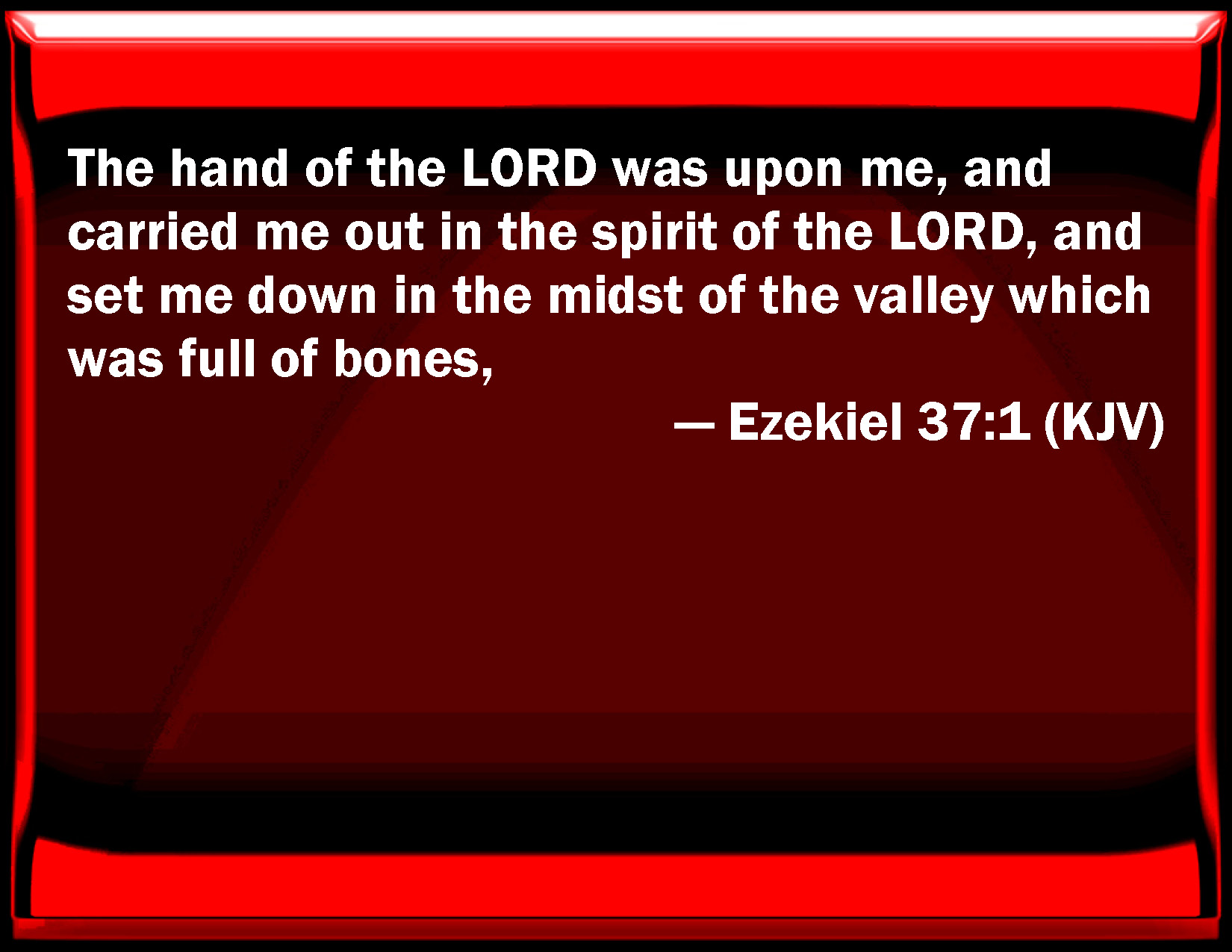 Bible Verse Slide Ezekiel 37:1 The hand of the LORD was on me, and carried me out in the spirit of the LORD, and set me down in the middle of the valley which was full of bones, KJV: The hand of the LORD was upon me, and carried me out in the spirit of the LORD, and set me down in the midst of the valley which was full of bones, DRB: The hand of the Lord was upon me, and brought me forth in the spirit of the Lord: and set me down in the midst of a plain that was full of bones. DBT: The hand of Jehovah was upon me, and Jehovah carried me out in the Spirit, and set me down in the midst of a valley; and it was full of bones. ERV: The hand of the LORD was upon me, and he carried me out in the spirit of the LORD, and set me down in the midst of the valley; and it was full of bones; WBT: The hand of the LORD was upon me, and carried me out in the spirit of the LORD, and set me down in the midst of the valley which was full of bones, WEB: The hand of Yahweh was on me, and he brought me out in the Spirit of Yahweh, and set me down in the midst of the valley; and it was full of bones. YLT: There hath been upon me a hand of Jehovah, and He taketh me forth in the Spirit of Jehovah, and doth place me in the midst of the valley, and it is full of bones,Links Ezekiel 37:1 NIV • Ezekiel 37:1 NLT • Ezekiel 37:1 ESV • Ezekiel 37:1 NASB • Ezekiel 37:1 KJV • Ezekiel 37:1 Interlinear • Ezekiel 37:1 Commentaries • Ezekiel 37:1 Parallel Texts • Ezekiel 37:1 Bible Apps • Ezekiel 37:1 Parallel • Bible Hub |