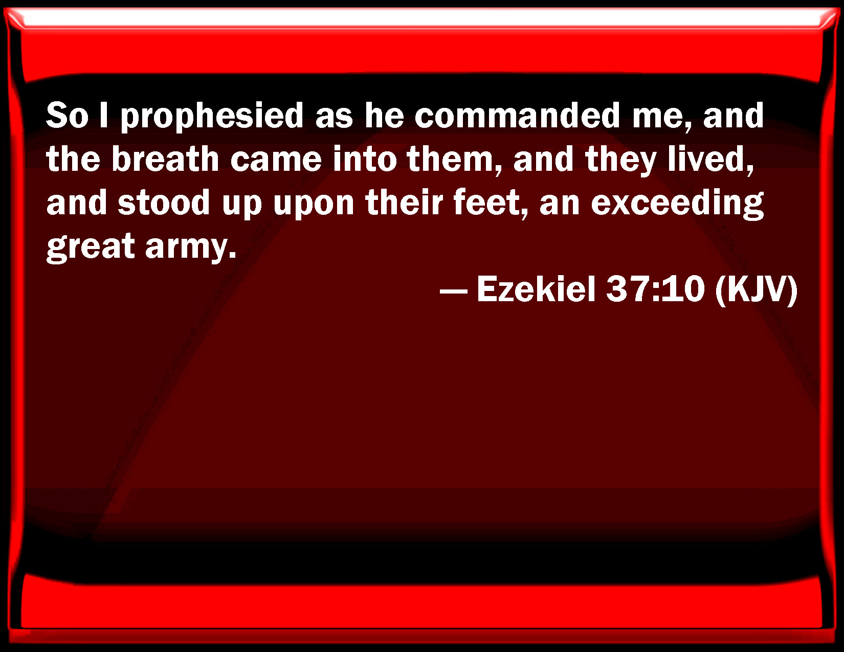 Bible Verse Slide Ezekiel 37:10 So I prophesied as he commanded me, and the breath came into them, and they lived, and stood up on their feet, an exceeding great army. KJV: So I prophesied as he commanded me, and the breath came into them, and they lived, and stood up upon their feet, an exceeding great army. DRB: And I prophesied as he had commanded me: and the spirit came into them, and they lived: and they stood up upon their feet, an exceeding great army. DBT: And I prophesied as he had commanded me, and the breath came into them, and they lived, and stood up upon their feet, an exceeding great army. ERV: So I prophesied as he commanded me; and the breath came into them, and they lived, and stood up upon their feet, an exceeding great army. WBT: So I prophesied as he commanded me, and the breath came into them, and they lived, and stood up upon their feet, an exceeding great army. WEB: So I prophesied as he commanded me, and the breath came into them, and they lived, and stood up on their feet, an exceedingly great army. YLT: And I have prophesied as He commanded me, and the Spirit cometh into them, and they live, and stand on their feet — a very very great force.Links Ezekiel 37:10 NIV • Ezekiel 37:10 NLT • Ezekiel 37:10 ESV • Ezekiel 37:10 NASB • Ezekiel 37:10 KJV • Ezekiel 37:10 Interlinear • Ezekiel 37:10 Commentaries • Ezekiel 37:10 Parallel Texts • Ezekiel 37:10 Bible Apps • Ezekiel 37:10 Parallel • Bible Hub |
