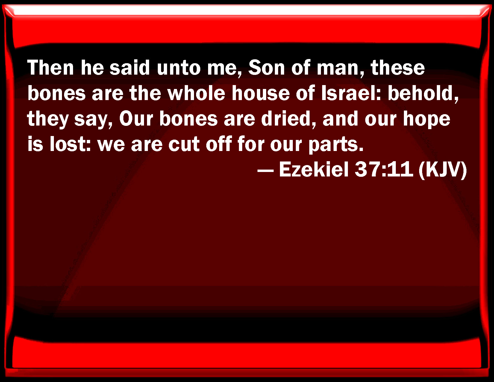 Bible Verse Slide Ezekiel 37:11 Then he said to me, Son of man, these bones are the whole house of Israel: behold, they say, Our bones are dried, and our hope is lost: we are cut off for our parts. KJV: Then he said unto me, Son of man, these bones are the whole house of Israel: behold, they say, Our bones are dried, and our hope is lost: we are cut off for our parts. DRB: And he said to me: Son of man: All these bones are the house of Israel : they say: Our bones are dried up, and our hope is lost, and we are cut off. DBT: And he said unto me, Son of man, these bones are the whole house of Israel. Behold, they say, Our bones are dried, and our hope is lost: we are cut off! ERV: Then he said unto me, Son of man, these bones are the whole house of Israel: behold, they say, Our bones are dried up, and our hope is lost; we are clean cut off. WBT: Then he said to me, Son of man, these bones are the whole house of Israel: behold, they say, Our bones are dried, and our hope is lost: we are cut off for our parts. WEB: Then he said to me, Son of man, these bones are the whole house of Israel: behold, they say, Our bones are dried up, and our hope is lost; we are clean cut off. YLT: And He saith unto me, 'Son of man, these bones are the whole house of Israel; lo, they are saying: Dried up have our bones, And perished hath our hope, We have been cut off by ourselves.Links Ezekiel 37:11 NIV • Ezekiel 37:11 NLT • Ezekiel 37:11 ESV • Ezekiel 37:11 NASB • Ezekiel 37:11 KJV • Ezekiel 37:11 Interlinear • Ezekiel 37:11 Commentaries • Ezekiel 37:11 Parallel Texts • Ezekiel 37:11 Bible Apps • Ezekiel 37:11 Parallel • Bible Hub |