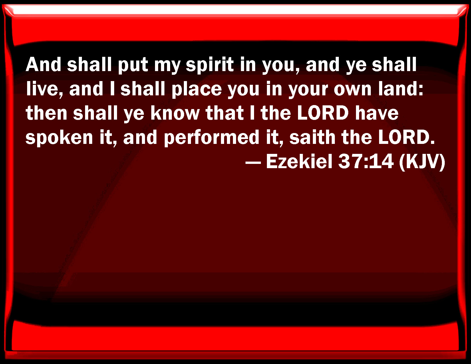 Bible Verse Slide Ezekiel 37:14 And shall put my spirit in you, and you shall live, and I shall place you in your own land: then shall you know that I the LORD have spoken it, and performed it, said the LORD. KJV: And shall put my spirit in you, and ye shall live, and I shall place you in your own land: then shall ye know that I the LORD have spoken it, and performed it, saith the LORD. DRB: And shall have put my spirit in you, and you shall live, and I shall make you rest upon your own land: and you shall know that I the Lord have spoken, and done it, saith the Lord God: DBT: And I will put my Spirit in you, and ye shall live, and I will place you in your own land: and ye shall know that I Jehovah have spoken, and have done it, saith Jehovah. ERV: And I will put my spirit in you, and ye shall live, and I will place you in your own land: and ye shall know that I the LORD have spoken it, and performed it, saith the LORD. WBT: And shall put my spirit in you, and ye shall live, and I shall place you in your own land: then shall ye know that I the LORD have spoken it, and performed it, saith the LORD. WEB: I will put my Spirit in you, and you shall live, and I will place you in your own land: and you shall know that I, Yahweh, have spoken it and performed it, says Yahweh. YLT: And I have given My Spirit in you, and ye have lived, And I have caused you to rest on your land, And ye have known that I Jehovah, I have spoken, and I have done it, An affirmation of Jehovah.'Links Ezekiel 37:14 NIV • Ezekiel 37:14 NLT • Ezekiel 37:14 ESV • Ezekiel 37:14 NASB • Ezekiel 37:14 KJV • Ezekiel 37:14 Interlinear • Ezekiel 37:14 Commentaries • Ezekiel 37:14 Parallel Texts • Ezekiel 37:14 Bible Apps • Ezekiel 37:14 Parallel • Bible Hub |