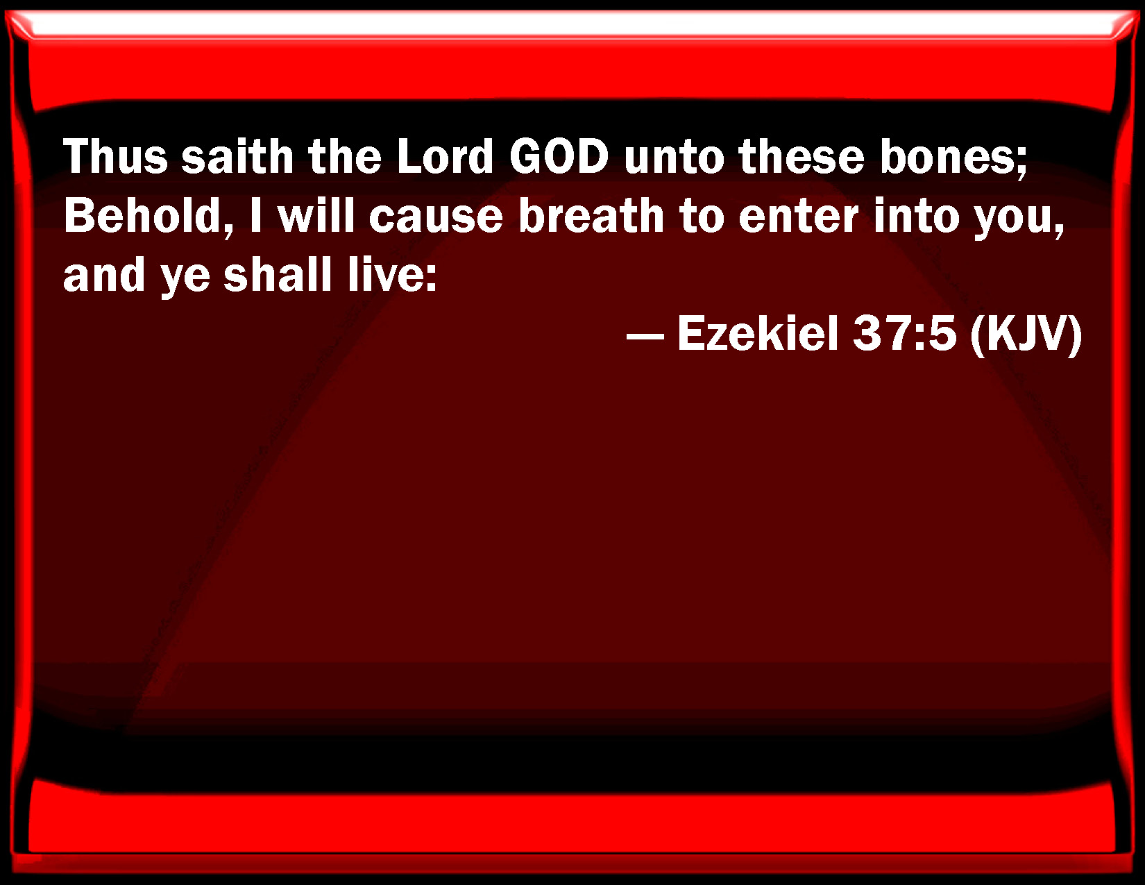 Bible Verse Slide Ezekiel 37:5 Thus said the Lord GOD to these bones; Behold, I will cause breath to enter into you, and you shall live: KJV: Thus saith the Lord GOD unto these bones; Behold, I will cause breath to enter into you, and ye shall live: DRB: Thus saith the Lord God to these bones: Behold, I will send spirit into you, and you shall live. DBT: Thus saith the Lord Jehovah unto these bones: Behold, I will cause breath to enter into you, and ye shall live. ERV: Thus saith the Lord GOD unto these bones: Behold, I will cause breath to enter into you, and ye shall live. WBT: Thus saith the Lord GOD to these bones; Behold, I will cause breath to enter into you, and ye shall live: WEB: Thus says the Lord Yahweh to these bones: Behold, I will cause breath to enter into you, and you shall live. YLT: Thus said the Lord Jehovah to these bones: Lo, I am bringing into you a spirit, and ye have lived,Links Ezekiel 37:5 NIV • Ezekiel 37:5 NLT • Ezekiel 37:5 ESV • Ezekiel 37:5 NASB • Ezekiel 37:5 KJV • Ezekiel 37:5 Interlinear • Ezekiel 37:5 Commentaries • Ezekiel 37:5 Parallel Texts • Ezekiel 37:5 Bible Apps • Ezekiel 37:5 Parallel • Bible Hub |