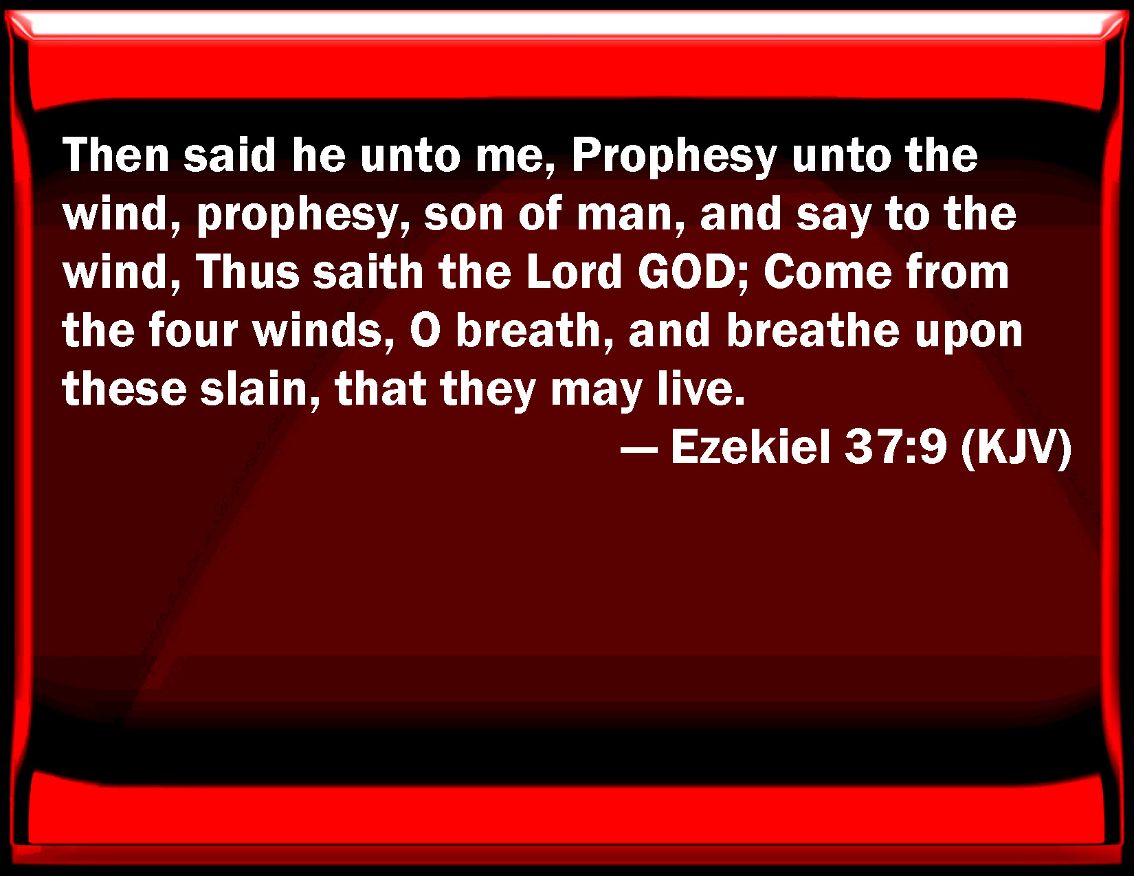 Bible Verse Slide Ezekiel 37:9 Then said he to me, Prophesy to the wind, prophesy, son of man, and say to the wind, Thus said the Lord GOD; Come from the four winds, O breath, and breathe on these slain, that they may live. KJV: Then said he unto me, Prophesy unto the wind, prophesy, son of man, and say to the wind, Thus saith the Lord GOD; Come from the four winds, O breath, and breathe upon these slain, that they may live. DRB: And he said to me: Prophesy to the spirit, prophesy, O son of man, and say to the spirit: Thus saith the Lord God: Come, spirit, from the four winds, and blow upon these slain, and let them live again. DBT: And he said unto me, Prophesy unto the wind, prophesy, son of man, and say to the wind, Thus saith the Lord Jehovah: Come from the four winds, O breath, and breathe upon these slain, that they may live. ERV: Then said he unto me, Prophesy unto the wind, prophesy, son of man, and say to the wind, Thus saith the Lord GOD: Come from the four winds, O breath, and breathe upon these slain, that they may live. WBT: Then said he to me, Prophesy to the wind, prophesy, son of man, and say to the wind, Thus saith the Lord GOD; Come from the four winds, O breath, and breathe upon these slain, that they may live. WEB: Then he said to me, Prophesy to the wind, prophesy, son of man, and tell the wind, Thus says the Lord Yahweh: Come from the four winds, breath, and breathe on these slain, that they may live. YLT: And He saith unto me: 'Prophesy unto the Spirit, prophesy, son of man, and thou hast said unto the Spirit: Thus said the Lord Jehovah: From the four winds come in, O Spirit, and breathe on these slain, and they do live.'Links Ezekiel 37:9 NIV • Ezekiel 37:9 NLT • Ezekiel 37:9 ESV • Ezekiel 37:9 NASB • Ezekiel 37:9 KJV • Ezekiel 37:9 Interlinear • Ezekiel 37:9 Commentaries • Ezekiel 37:9 Parallel Texts • Ezekiel 37:9 Bible Apps • Ezekiel 37:9 Parallel • Bible Hub |