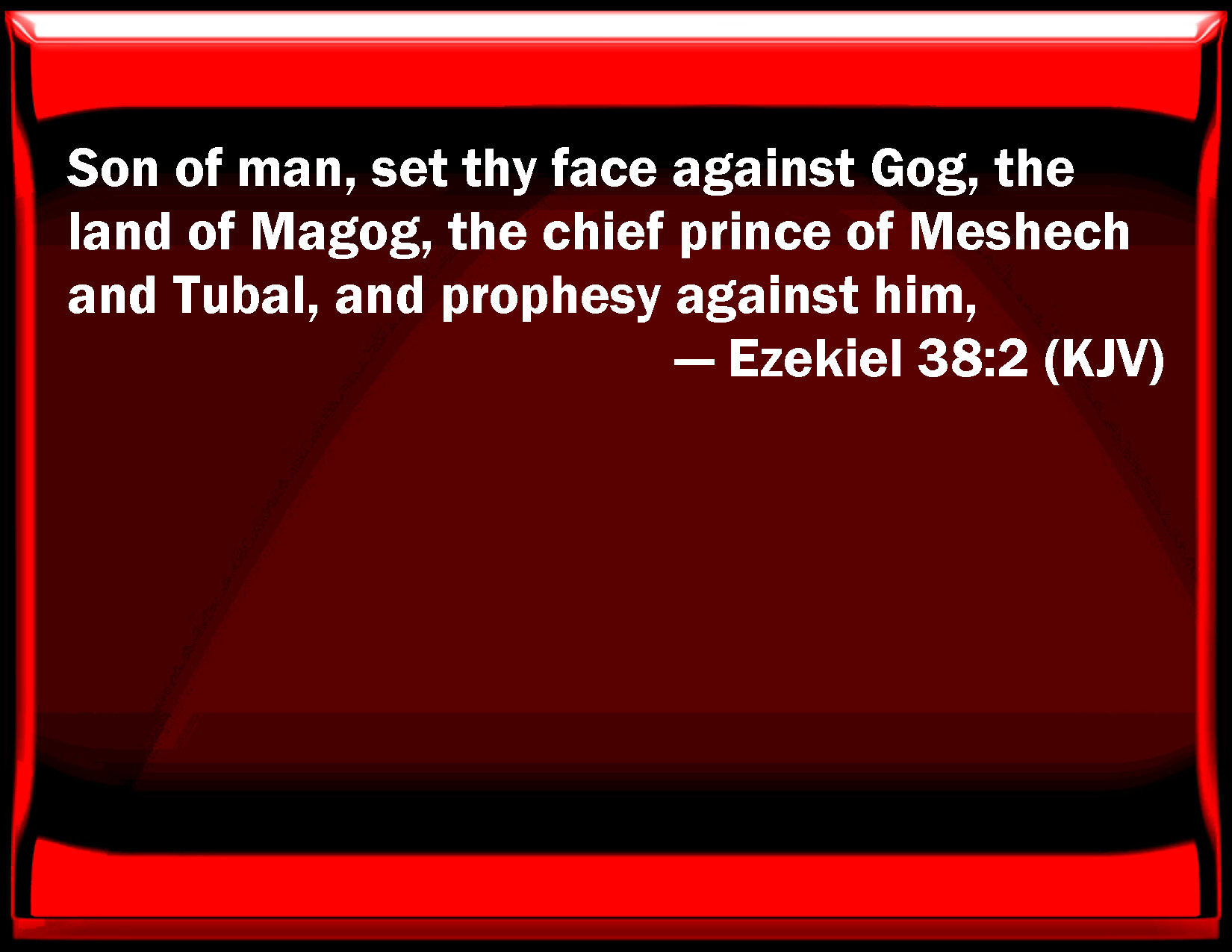 Bible Verse Slide Ezekiel 38:2 Son of man, set your face against Gog, the land of Magog, the chief prince of Meshech and Tubal, and prophesy against him, KJV: Son of man, set thy face against Gog, the land of Magog, the chief prince of Meshech and Tubal, and prophesy against him, DRB: Son of man, set thy face against Gog, the land of Magog, the chief prince of Mosoch and Thubal: and prophesy of him, DBT: Son of man, set thy face against Gog, the land of Magog, the prince of Rosh, Meshech, and Tubal, and prophesy against him, ERV: Son of man, set thy face toward Gog, of the land of Magog, the prince of Rosh, Meshech, and Tubal, and prophesy against him, WBT: Son of man, set thy face against Gog, the land of Magog, the chief prince of Meshech and Tubal, and prophesy against him. WEB: Son of man, set your face toward Gog, of the land of Magog, the prince of Rosh, Meshech, and Tubal, and prophesy against him, YLT: 'Son of man, set thy face unto Gog, of the land of Magog, prince of Rosh, Meshech, and Tubal, and prophesy concerning him,Links Ezekiel 38:2 NIV • Ezekiel 38:2 NLT • Ezekiel 38:2 ESV • Ezekiel 38:2 NASB • Ezekiel 38:2 KJV • Ezekiel 38:2 Interlinear • Ezekiel 38:2 Commentaries • Ezekiel 38:2 Parallel Texts • Ezekiel 38:2 Bible Apps • Ezekiel 38:2 Parallel • Bible Hub |