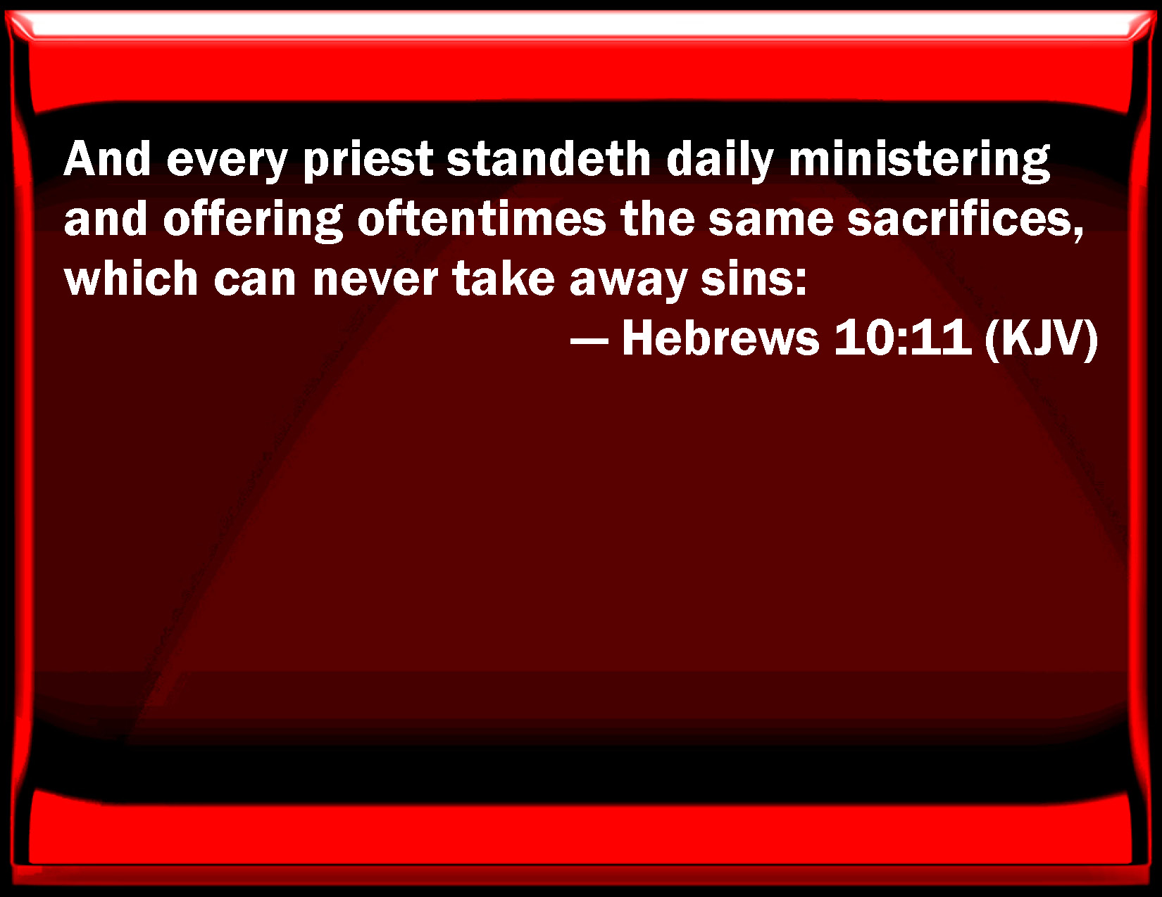 Bible Verse Slide Hebrews 10:11 And every priest stands daily ministering and offering oftentimes the same sacrifices, which can never take away sins: KJV: And every priest standeth daily ministering and offering oftentimes the same sacrifices, which can never take away sins: DRB: And every priest indeed standeth daily ministering, and often offering the same sacrifices, which can never take away sins. DBT: And every priest stands daily ministering, and offering often the same sacrifices, which can never take away sins. ERV: And every priest indeed standeth day by day ministering and offering oftentimes the same sacrifices, the which can never take away sins: WBT: And every priest standeth daily ministering and offering often the same sacrifices, which can never take away sins: WEB: Every priest indeed stands day by day serving and often offering the same sacrifices, which can never take away sins, YLT: and every priest, indeed, hath stood daily serving, and the same sacrifices many times offering, that are never able to take away sins.Links Hebrews 10:11 NIV • Hebrews 10:11 NLT • Hebrews 10:11 ESV • Hebrews 10:11 NASB • Hebrews 10:11 KJV • Hebrews 10:11 Interlinear • Hebrews 10:11 Commentaries • Hebrews 10:11 Parallel Texts • Hebrews 10:11 Bible Apps • Hebrews 10:11 Parallel • Bible Hub |