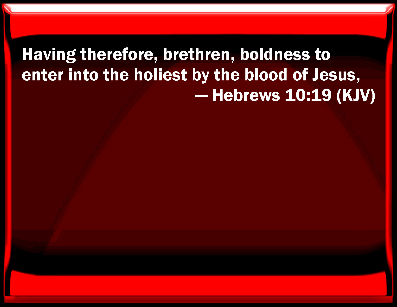 Bible Verse Slide Hebrews 10:19 Having therefore, brothers, boldness to enter into the holiest by the blood of Jesus, KJV: Having therefore, brethren, boldness to enter into the holiest by the blood of Jesus, DRB: Having therefore, brethren, a confidence in the entering into the holies by the blood of Christ; DBT: Having therefore, brethren, boldness for entering into the holy of holies by the blood of Jesus, ERV: Having therefore, brethren, boldness to enter into the holy place by the blood of Jesus, WBT: Having therefore, brethren, boldness to enter into the holiest by the blood of Jesus, WEB: Having therefore, brothers, boldness to enter into the holy place by the blood of Jesus, YLT: Having, therefore, brethren, boldness for the entrance into the holy places, in the blood of Jesus,Links Hebrews 10:19 NIV • Hebrews 10:19 NLT • Hebrews 10:19 ESV • Hebrews 10:19 NASB • Hebrews 10:19 KJV • Hebrews 10:19 Interlinear • Hebrews 10:19 Commentaries • Hebrews 10:19 Parallel Texts • Hebrews 10:19 Bible Apps • Hebrews 10:19 Parallel • Bible Hub |