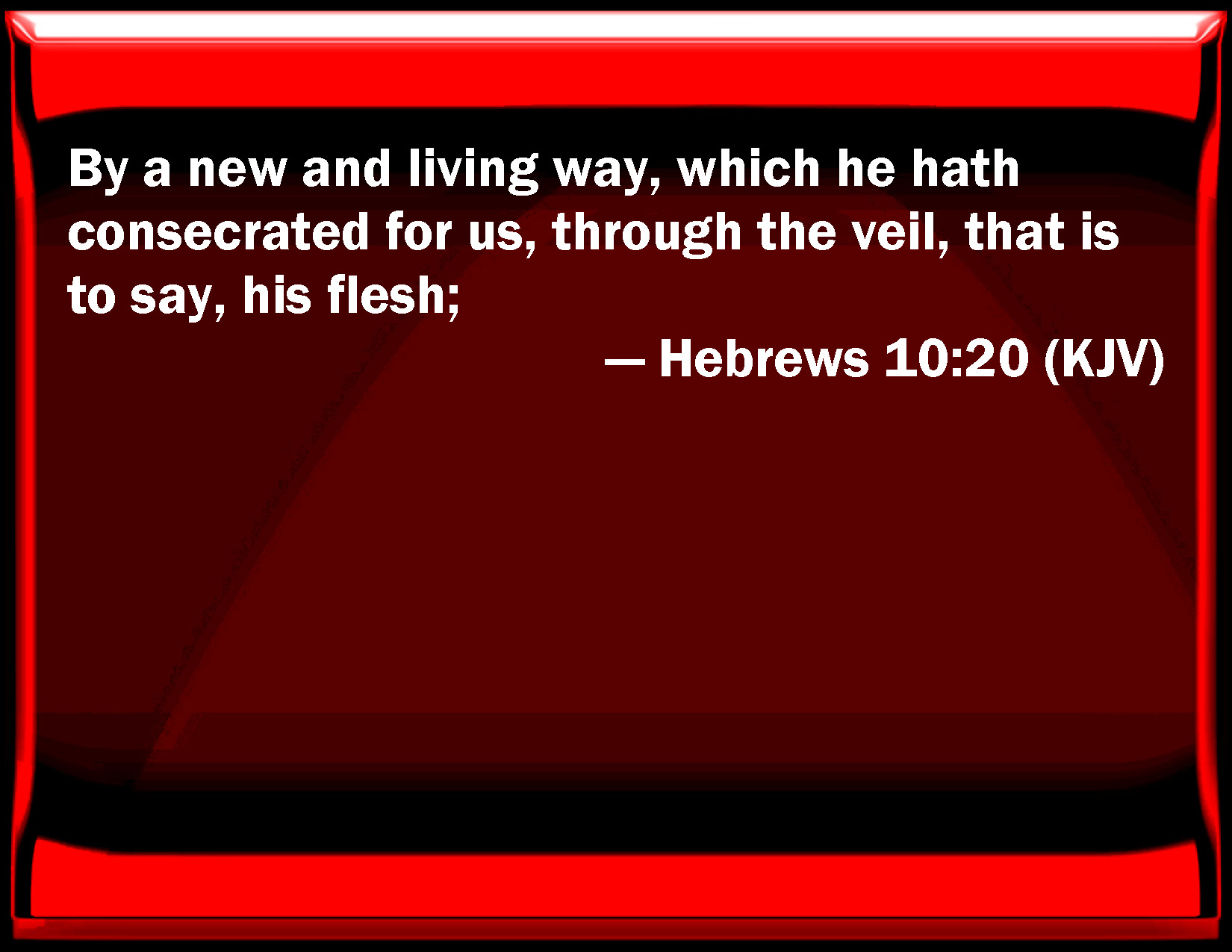 Bible Verse Slide Hebrews 10:20 By a new and living way, which he has consecrated for us, through the veil, that is to say, his flesh; KJV: By a new and living way, which he hath consecrated for us, through the veil, that is to say, his flesh; DRB: A new and living way which he hath dedicated for us through the veil, that is to say, his flesh, DBT: the new and living way which he has dedicated for us through the veil, that is, his flesh, ERV: by the way which he dedicated for us, a new and living way, through the veil, that is to say, his flesh; WBT: By a new and living way, which he hath consecrated for us, through the vail, that is to say, his flesh; WEB: by the way which he dedicated for us, a new and living way, through the veil, that is to say, his flesh; YLT: which way he did initiate for us — new and living, through the vail, that is, his flesh — Links Hebrews 10:20 NIV • Hebrews 10:20 NLT • Hebrews 10:20 ESV • Hebrews 10:20 NASB • Hebrews 10:20 KJV • Hebrews 10:20 Interlinear • Hebrews 10:20 Commentaries • Hebrews 10:20 Parallel Texts • Hebrews 10:20 Bible Apps • Hebrews 10:20 Parallel • Bible Hub |