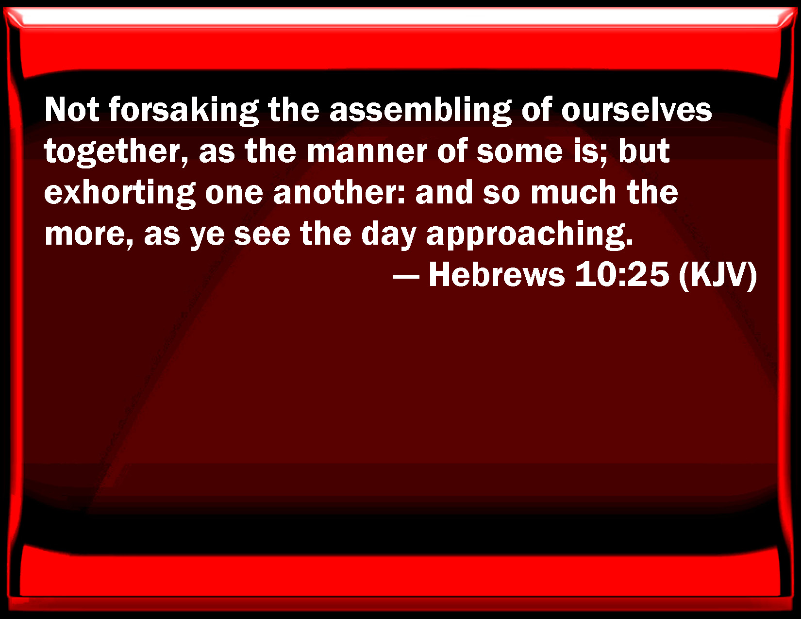 Bible Verse Slide Hebrews 10:25 Not forsaking the assembling of ourselves together, as the manner of some is; but exhorting one another: and so much the more, as you see the day approaching. KJV: Not forsaking the assembling of ourselves together, as the manner of some is; but exhorting one another: and so much the more, as ye see the day approaching. DRB: Not forsaking our assembly, as some are accustomed; but comforting one another, and so much the more as you see the day approaching. DBT: not forsaking the assembling of ourselves together, as the custom is with some; but encouraging one another, and by so much the more as ye see the day drawing near. ERV: not forsaking the assembling of ourselves together, as the custom of some is, but exhorting one another; and so much the more, as ye see the day drawing nigh. WBT: Not forsaking the assembling of ourselves, as the manner of some is; but exhorting one another: and so much the more, as ye see the day approaching. WEB: not forsaking our own assembling together, as the custom of some is, but exhorting one another; and so much the more, as you see the Day approaching. YLT: not forsaking the assembling of ourselves together, as a custom of certain is, but exhorting, and so much the more as ye see the day coming nigh.Links Hebrews 10:25 NIV • Hebrews 10:25 NLT • Hebrews 10:25 ESV • Hebrews 10:25 NASB • Hebrews 10:25 KJV • Hebrews 10:25 Interlinear • Hebrews 10:25 Commentaries • Hebrews 10:25 Parallel Texts • Hebrews 10:25 Bible Apps • Hebrews 10:25 Parallel • Bible Hub |