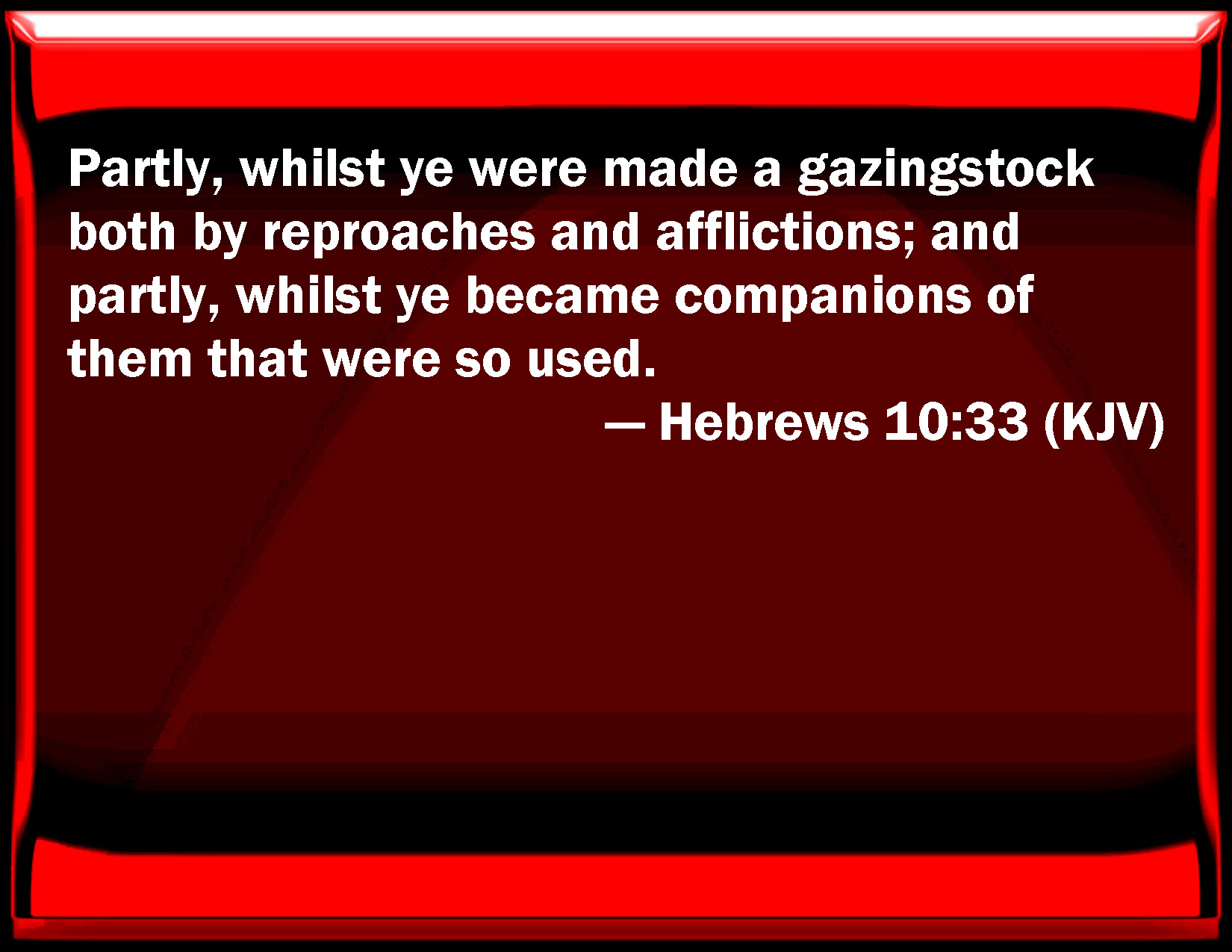 Bible Verse Slide Hebrews 10:33 Partly, whilst you were made a spectacle both by reproaches and afflictions; and partly, whilst you became companions of them that were so used. KJV: Partly, whilst ye were made a gazingstock both by reproaches and afflictions; and partly, whilst ye became companions of them that were so used. DRB: And on the one hand indeed, by reproaches and tribulations, were made a gazingstock; and on the other, became companions of them that were used in such sort. DBT: on the one hand, when ye were made a spectacle both in reproaches and afflictions; and on the other, when ye became partakers with those who were passing through them. ERV: partly, being made a gazingstock both by reproaches and afflictions; and partly, becoming partakers with them that were so used. WBT: Partly, while ye were made a gazing-stock both by reproaches and afflictions; and partly, while ye became companions of them that were so used. WEB: partly, being exposed to both reproaches and oppressions; and partly, becoming partakers with those who were treated so. YLT: partly both with reproaches and tribulations being made spectacles, and partly having become partners of those so living,Links Hebrews 10:33 NIV • Hebrews 10:33 NLT • Hebrews 10:33 ESV • Hebrews 10:33 NASB • Hebrews 10:33 KJV • Hebrews 10:33 Interlinear • Hebrews 10:33 Commentaries • Hebrews 10:33 Parallel Texts • Hebrews 10:33 Bible Apps • Hebrews 10:33 Parallel • Bible Hub |